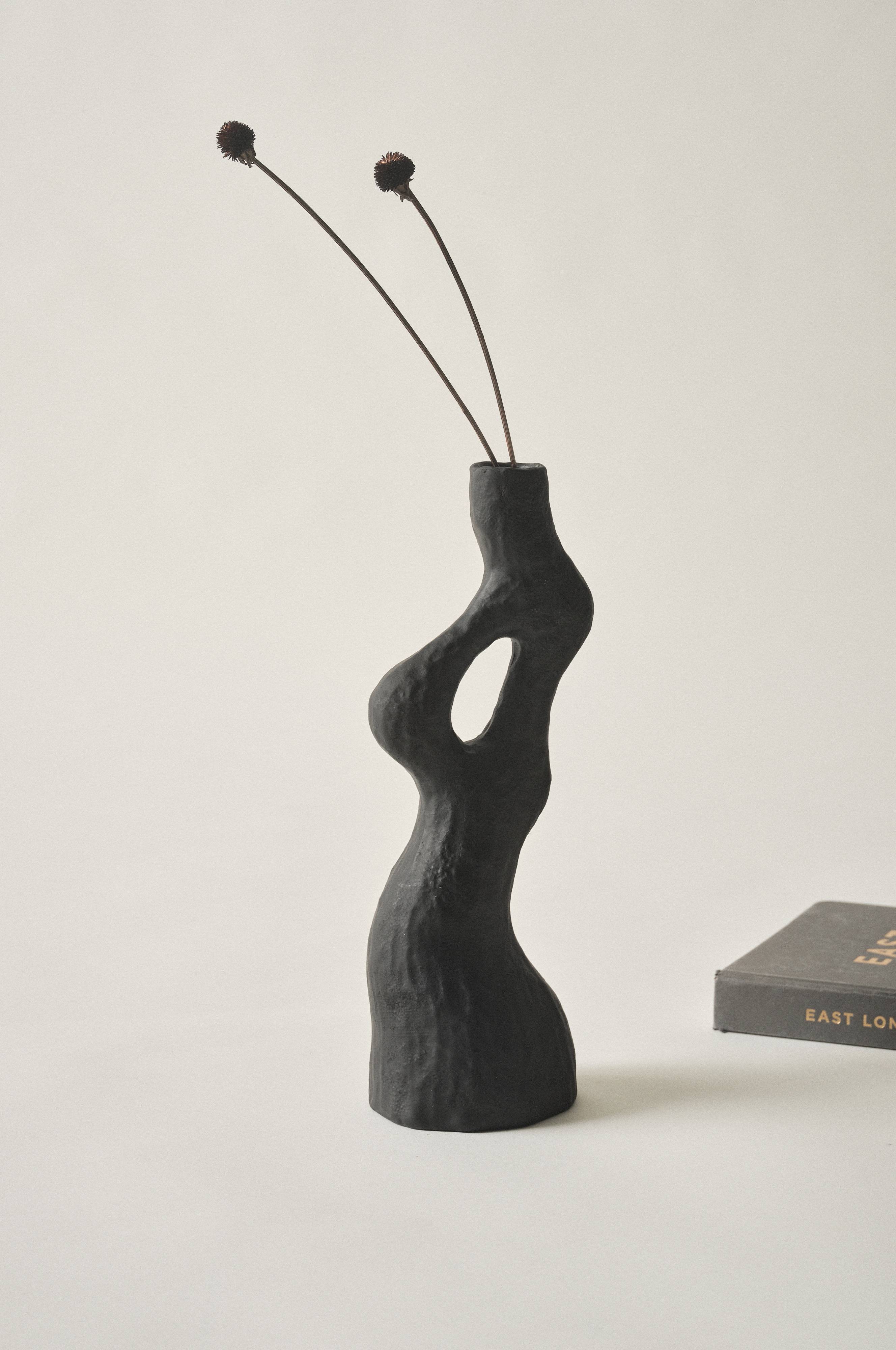 Dekoracyjny wazon z żywicy epoksydowej o gibkim i falistym kształcie, który przywodzi na myśl świat natury. Wazon jest duży i odważny, a dzięki intrygującej formie pięknie prezentuje się tak ozdobiony gałązką jak i bez dekoracji.