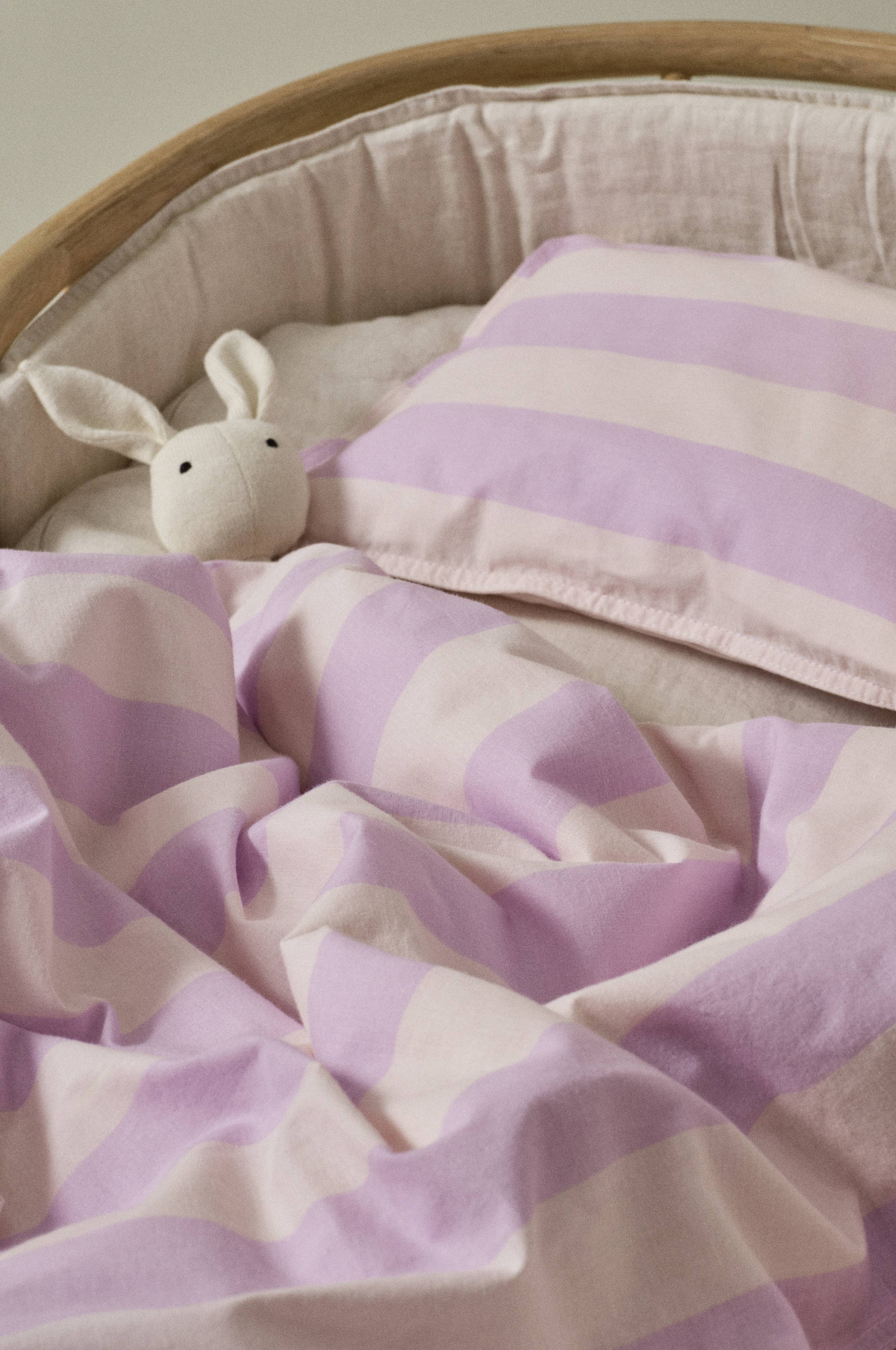 Dwuczęściowy komplet pościeli z ekologicznej bawełny. Komplet nadaje się do wózków i kołysek. Nadrukowany wzór grubych pasów zawsze ma w sobie coś świeżego, nawet dla najmłodszych, a ekologiczna bawełna jest chłodna i przyjemna dla skóry. Ponadto, składający się z poszewki i poszwy komplet został poddany praniu przemysłowemu, co oznacza, że po uszyciu był wyprany, dzięki czemu zyskał na miękkości i wyglądzie. Biegnący wokół poszewki i poszwy podwójny szew nadaje całości ekskluzywnego charakteru. Gęstość splotu materiału wynosi 144 TC. (Gęstość splotu materiału oznacza ilość przeplecionych ze sobą nici, thread count, na cal kwadratowy materiału. Im wyższa gęstość tym lepsza jakość).