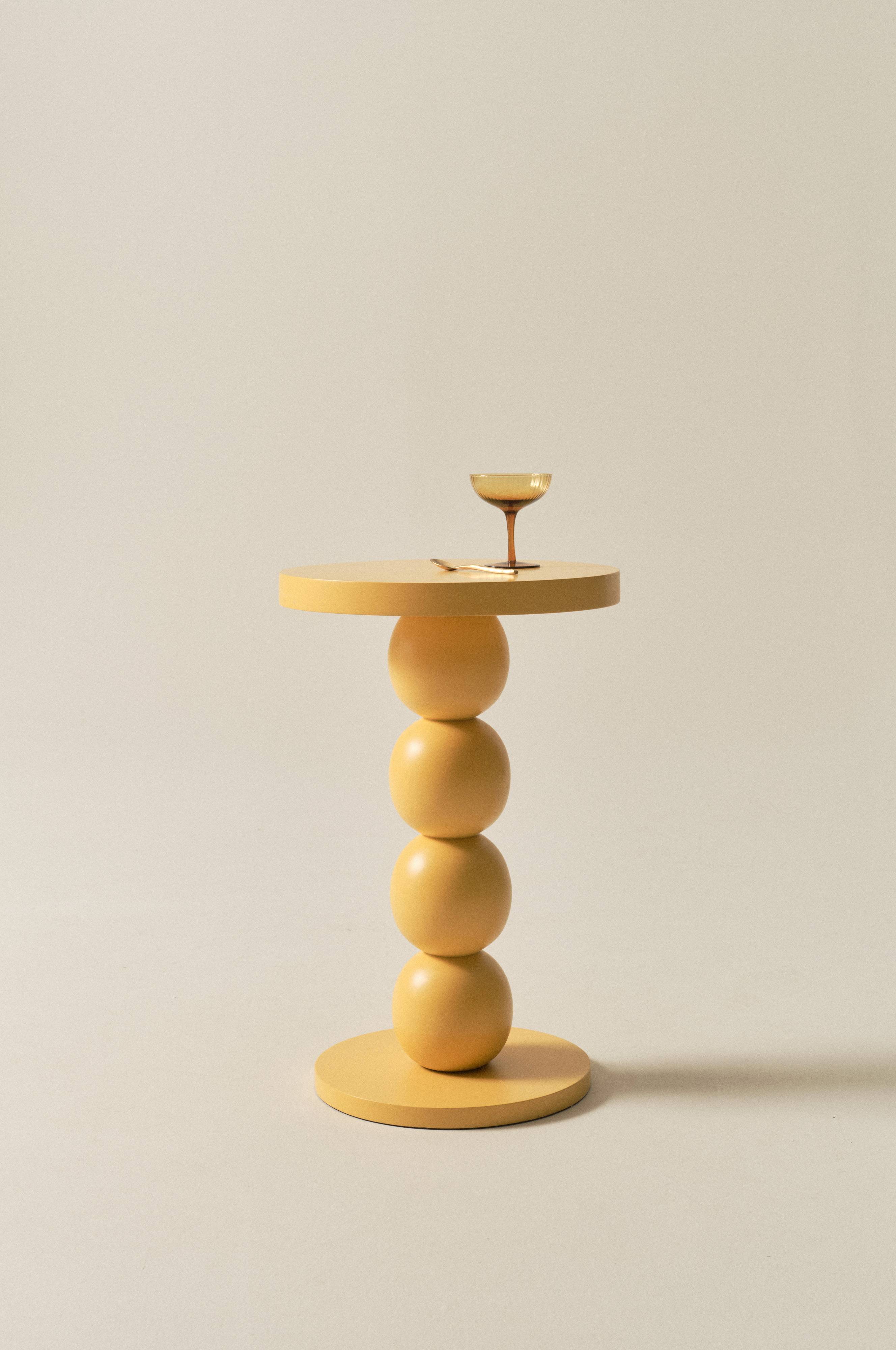 Okrągły stolik z litego drewna mango pomalowanego w żywe kolory. Ten niewielki stolik na kolumnie jest pomalowany na jeden kolor i odznacza się kształtem, który przywoła uśmiech u wielu, stolik ten ma po prostu wesoły kształt i kolor.