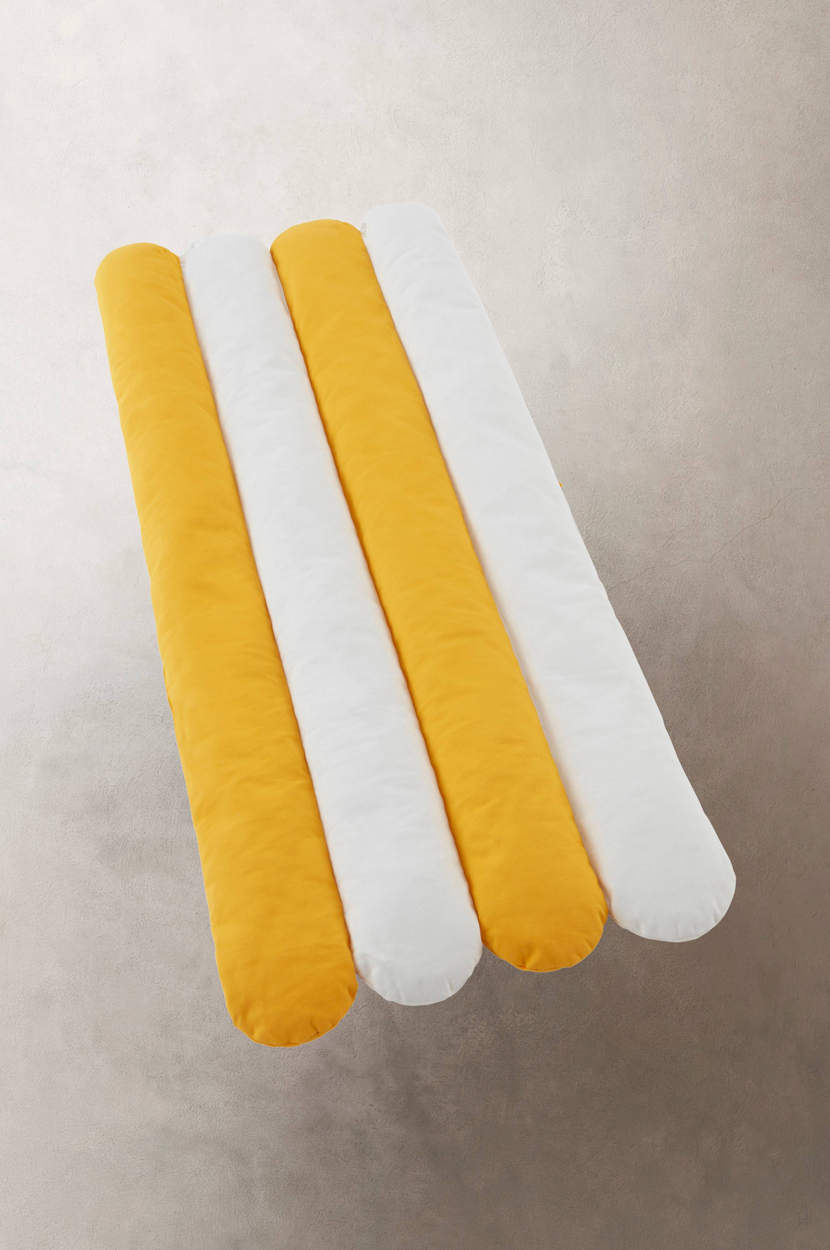 Materac plażowy dla dzieci, utrzymany w radosnych kolorach. Materac pokrywa dwukolorowa tkanina z płótna bawełnianego, a wypełnienie stanowi miękki poliester. Materac jest pikowany pionowo, dzięki czemu wypełnienie pozostaje na miejscu. Uchwyt do przenoszenia sprawia, że materac zawsze łatwo zabrać ze sobą na plażę lub do ogrodu. Troczki i rzepy pozwolą zwinąć materac w rulon.