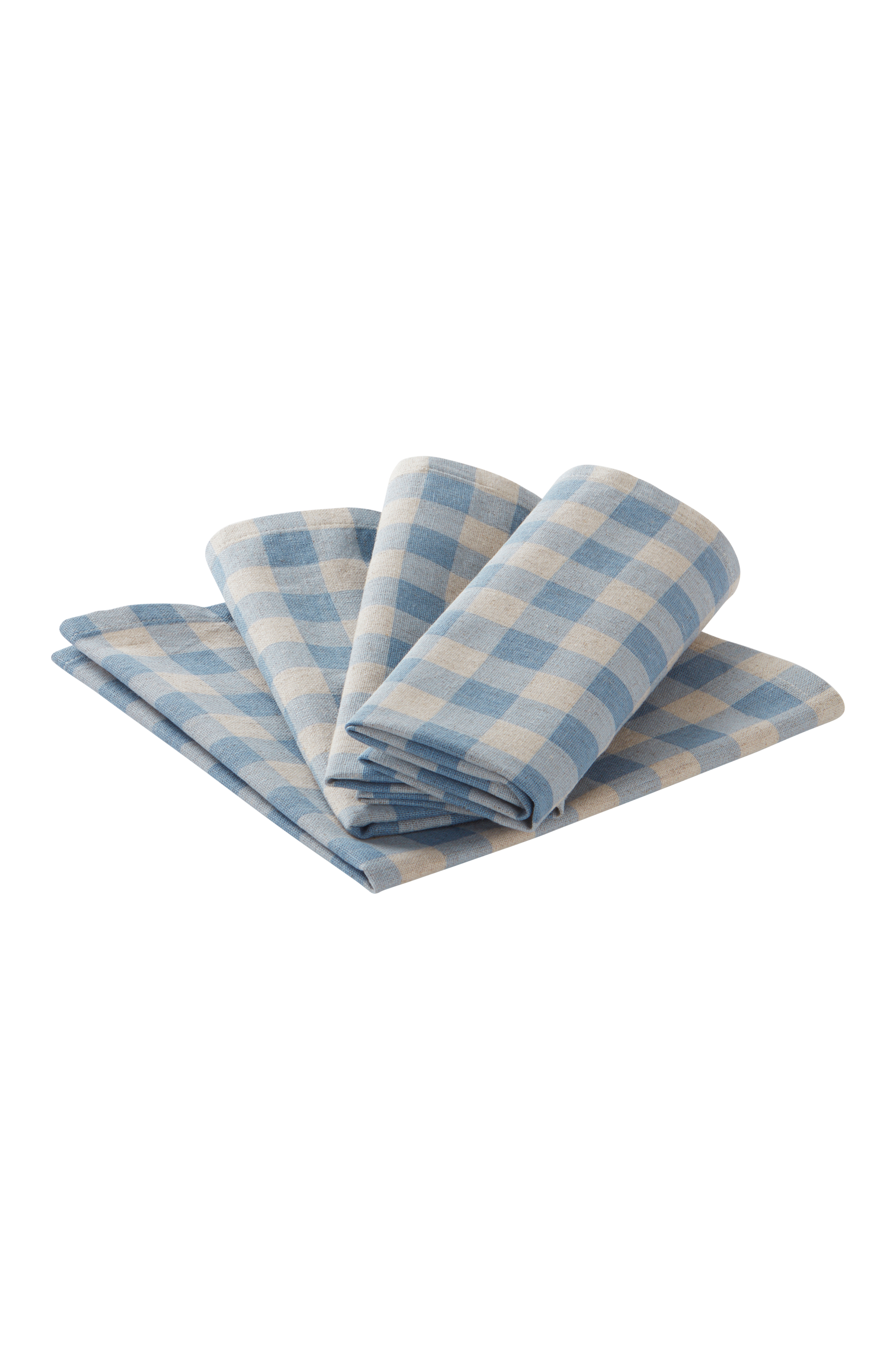4 serwetki z mieszanki bawełnianej z domieszką lnu nadającego tkaninie sztywności. Serwetki mają nadrukowany wzór kraty, który jest równocześnie klasyczny i świeży.