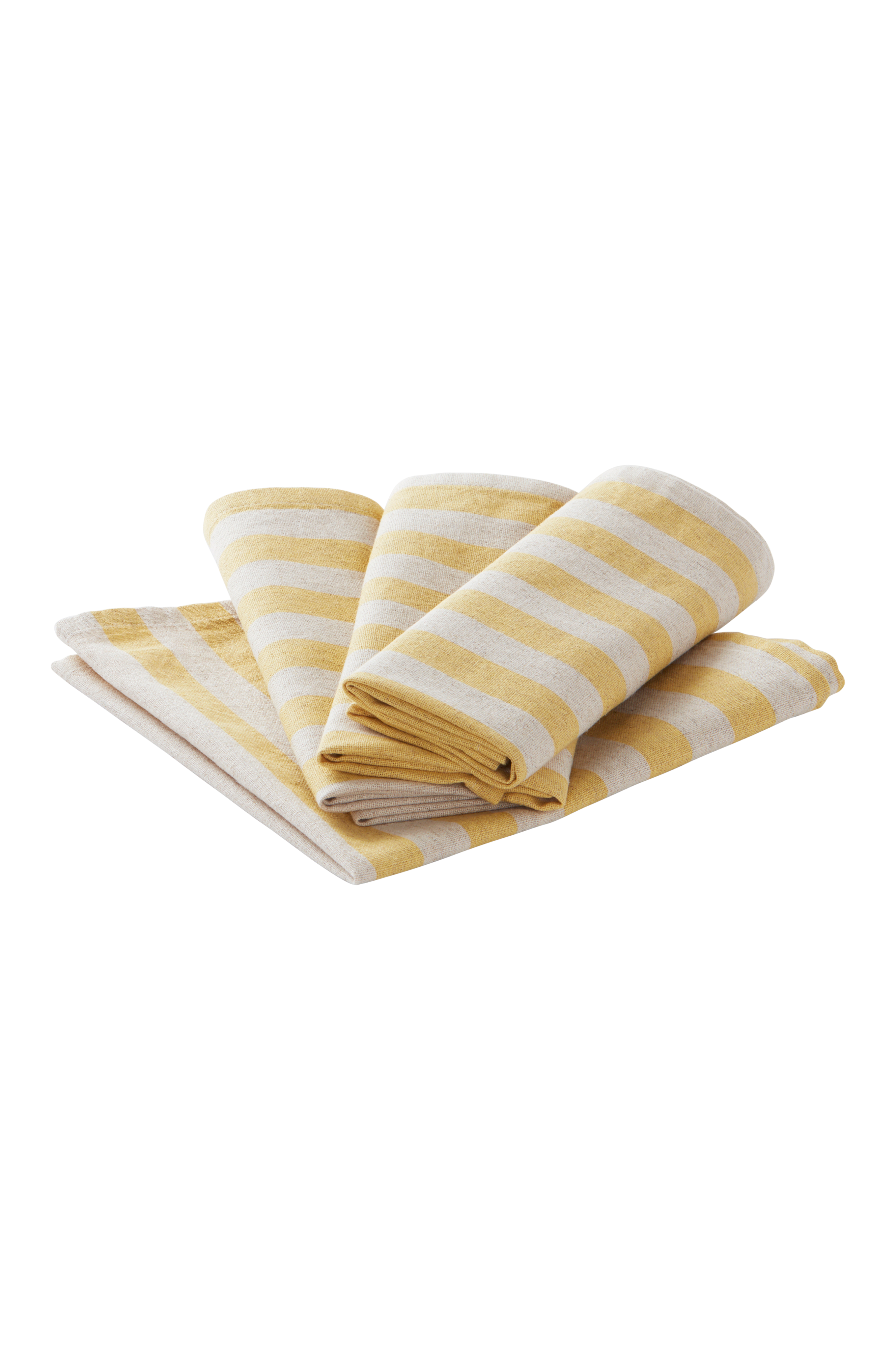 4 serwetki z mieszanki bawełnianej z domieszką lnu nadającego tkaninie sztywności. Serwetki mają nadrukowany wzór pasków, który jest równocześnie klasyczny i świeży.