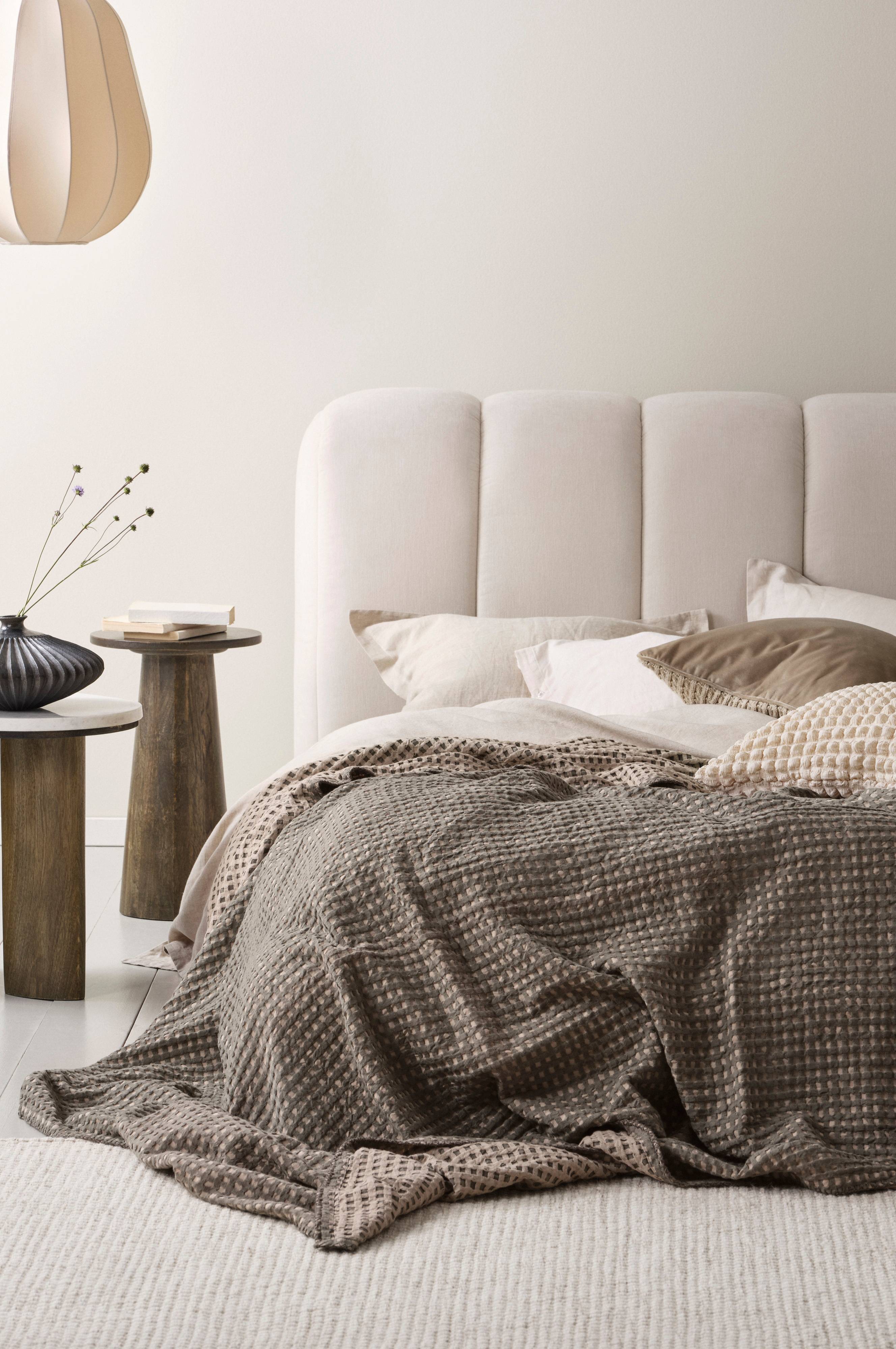 Narzuta na łóżko podwójne. Narzuta została wykonana z miękkiej i pięknej tkaniny bawełnianej oraz została poddana praniu enzymatycznemu, dzięki czemu jest jeszcze bardziej miękka. Narzuta jest elastyczna i łatwo zaścielić nią łóżko. Wzór kraty z barwionej przędzy, stworzony dzięki specjalnej technice tkania, jest jednocześnie efektowny i dyskretny. Brzeg narzuty jest obrębiony pasującym kolorem.