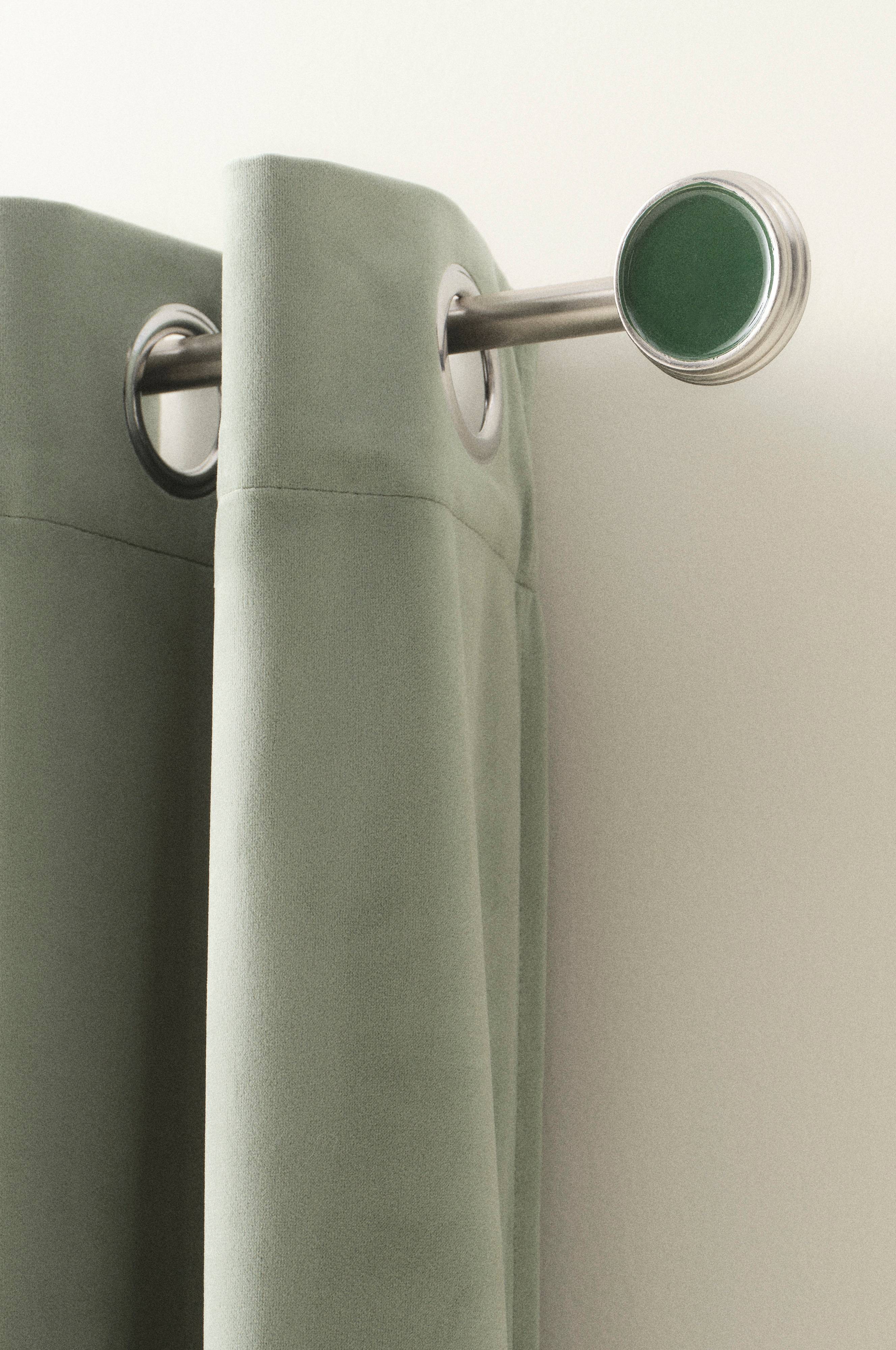 Karnisz z prętem i wspornikami z żelaza są niklowane, aluminiowe końcówki są ozdobione emalią. AMYto cały zestaw składający się z karnisza, akcesoriów do niego i okrągłych końcówek z intensywnie zieloną emalią. Karnisz wyposażony jest w regulację długości, dzięki czemu nie musisz martwić się niestandardowym wymiarem okien. Regulowane kotwy pozwalają samodzielnie ustawić odległość od ściany w zakresie 10-12 cm. Końcówki przykręcane są do karnisza. Trzy wsporniki, śruby oraz kołek w zestawie. Weź pod uwagę, że najlepszy w danym przypadku rodzaj zawieszenia zależy od powierzchni, na której ma zostać zamontowany.