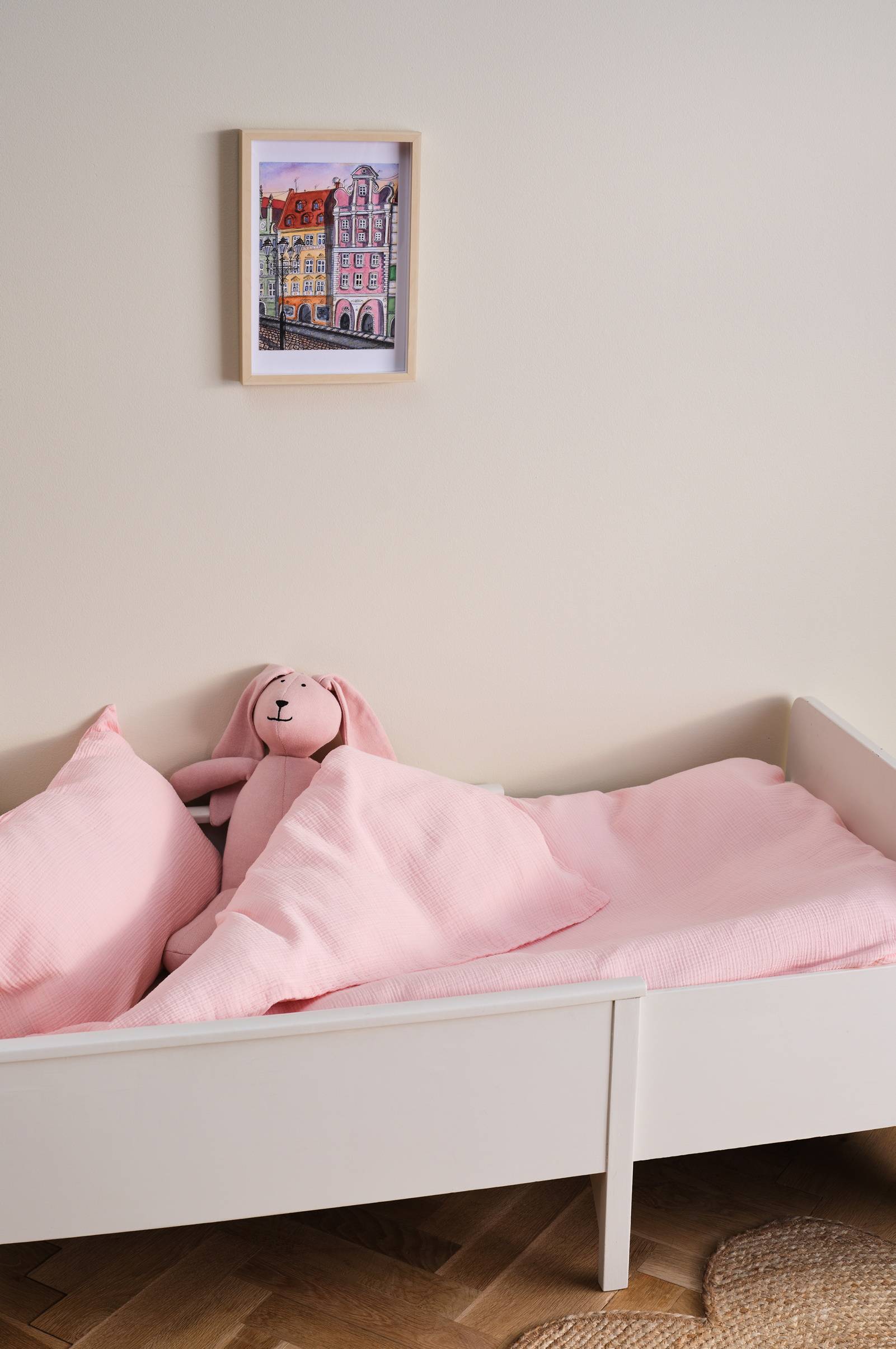 Zestaw pościeli AMILIA, wykonany z bawełnianego muślinu, oferuje wyjątkową miękkość w stylu vintage dzięki barwionemu wykończeniu. Dostosowany do łóżeczka, ten uroczy zestaw zawiera jedną poszewkę na poduszkę i jedną poszwę na kołdrę, zapewniając przytulne ciepło i ponadczasowy akcent w każdym pokoju dziecięcym.
