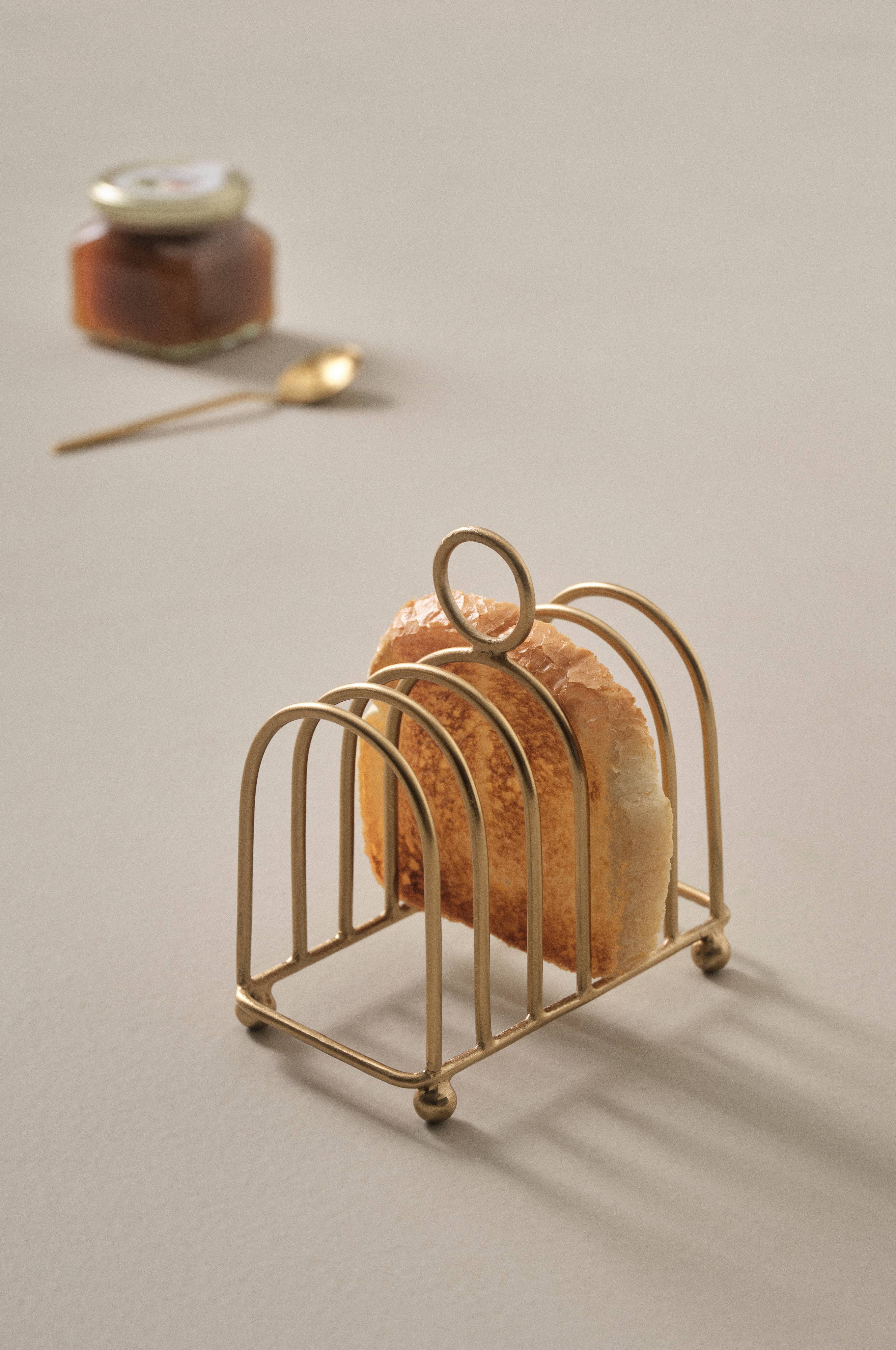 Stojak na tosty wykonany z żelaza o przyjemnym ciężarze i charakterze. Stojak na tosty mieści sześć kromek i nadaje nakrytemu do śniadania stołowi cudownie klasycznego charakteru. Dzięki drobnym, okrągłym nóżkom chleb nie dotyka powierzchni blatu. Z pierścieniem u góry z łatwością uniesiesz opieczone kromki do góry zapraszając tym innych do stołu. Powierzchnia metalu jest platerowana na kolor złoty.