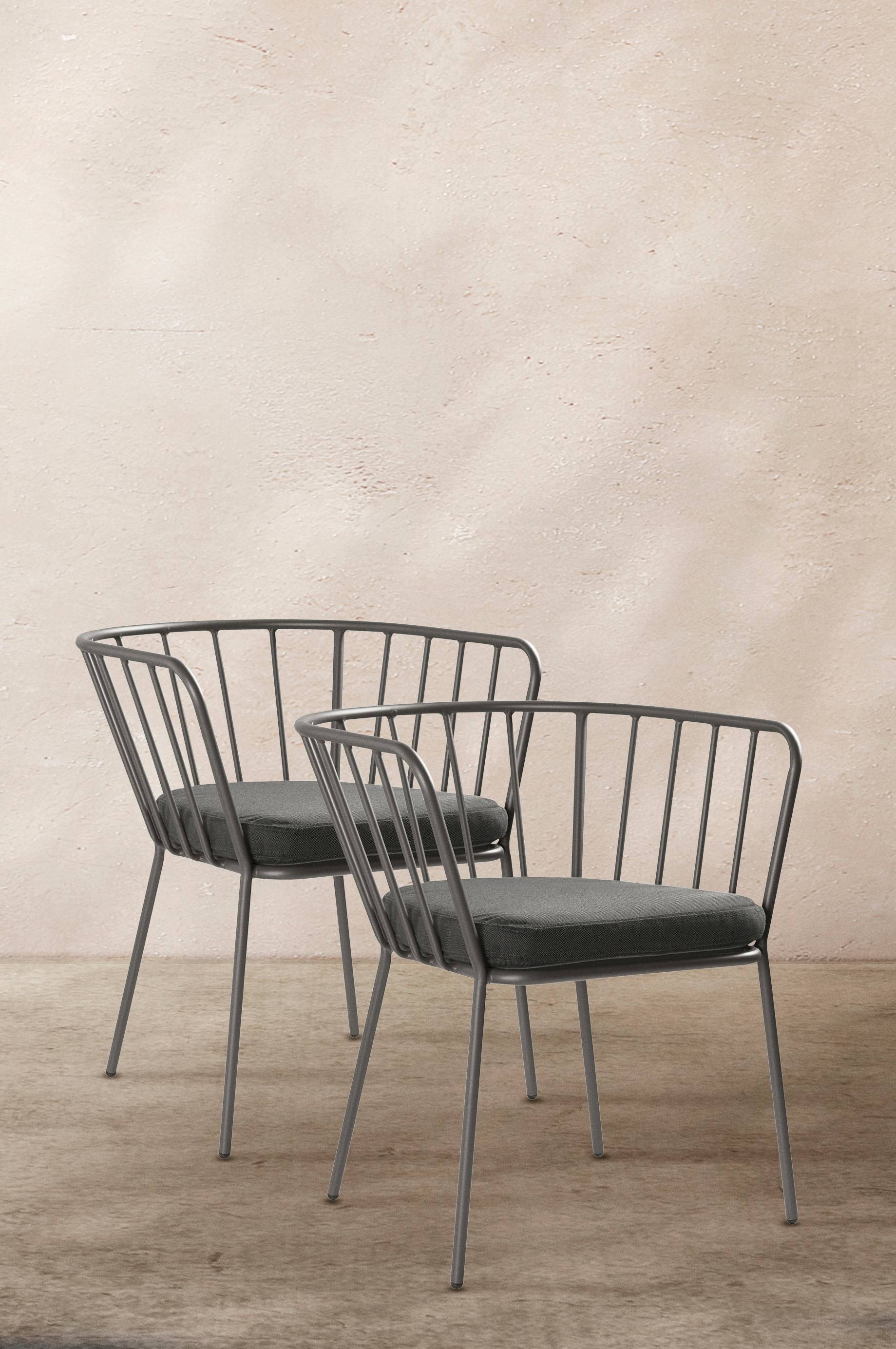 2 krzesła z lakierowanego proszkowo matowego aluminium z wytrzymałą, materiałową poduszką. Kawa na świeżym powietrzu to element wiosny i lata, dlatego zasługuje na ułatwienia. ANTIBES to piękne i praktyczne krzesła, które wytrzymają każdą pogodę i wiatr, więc nie trzeba ich ciągle wstawiać i wystawiać.