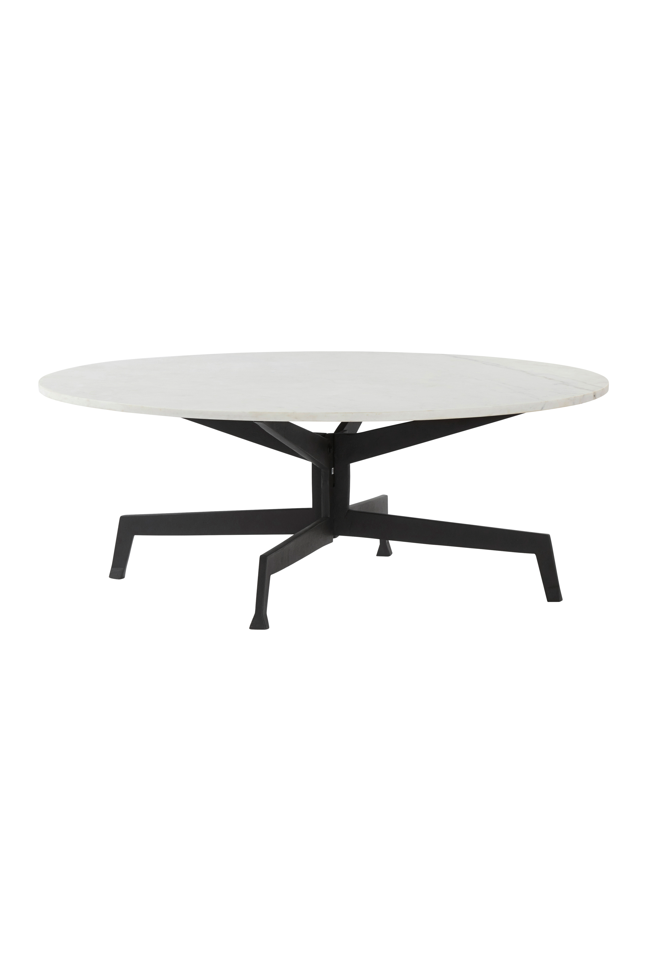 Okrągły stolik kawowy z marmurowym blatem i żelazną podstawą o matowej, czarnej powierzchni. Marmur to klasyk, a przy odpowiedniej pielęgnacji można go długo utrzymywać. Żelazna podstawa ładnie kontrastuje z blatem zarówno pod względem kanciastego kształtu, jak i szorstkiego materiału, dając przyjemne połączenie. Wymaga częściowego montażu.