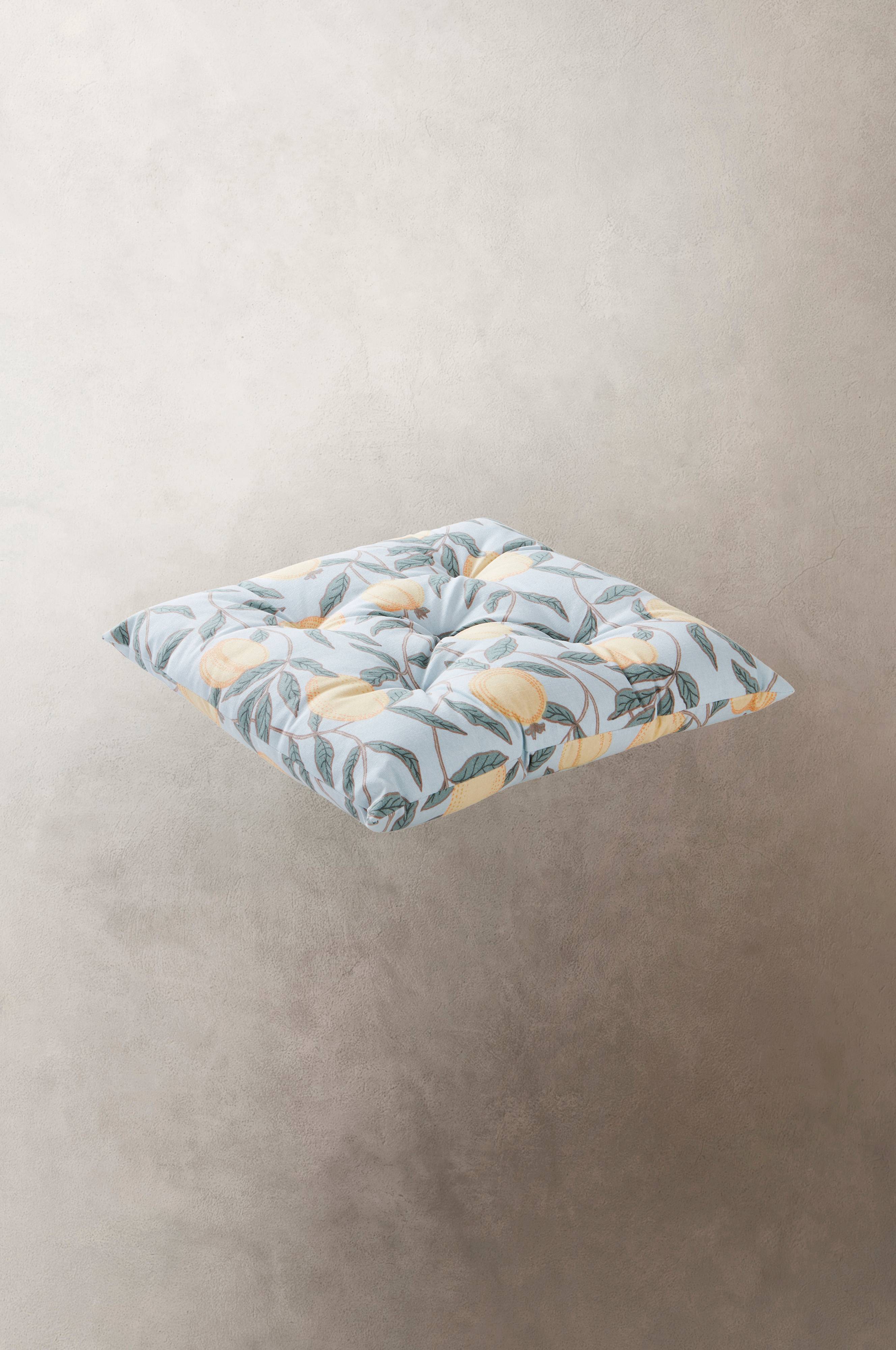Poduszka do siedzenia z zewnętrzną tkaniną wykonaną z bawełnianej półpanamy z tyłem pokrytym akrylanem, uzupełniona miękkim wypełnieniem z poliestru. Tkaninę zdobi wiosenny i radosny wzór cytrusów na jasnym tle. Zewnętrzna strona tkaniny jest przyjemnie matowa, a w dotyku przypomina zwykłą tkaninę. Akrylanowe pokrycie sprawia, że poduszka jest praktyczna, wytrzymała i wodoodporna.