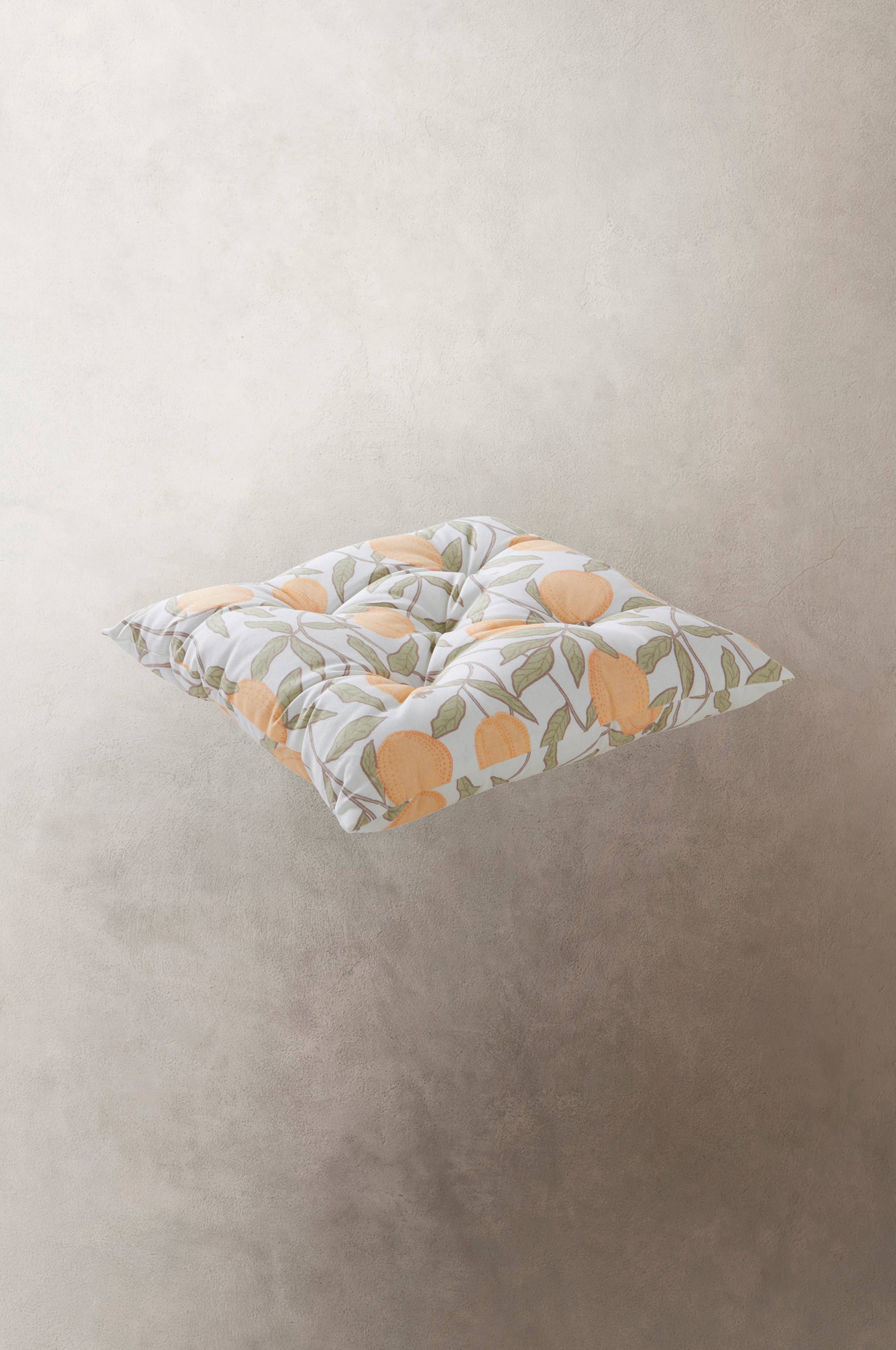 Poduszka do siedzenia z zewnętrzną tkaniną wykonaną z bawełnianej półpanamy z tyłem pokrytym akrylanem, uzupełniona miękkim wypełnieniem z poliestru. Tkaninę zdobi wiosenny i radosny wzór cytrusów na jasnym tle. Zewnętrzna strona tkaniny jest przyjemnie matowa, a w dotyku przypomina zwykłą tkaninę. Akrylanowe pokrycie sprawia, że poduszka jest praktyczna, wytrzymała i wodoodporna.
