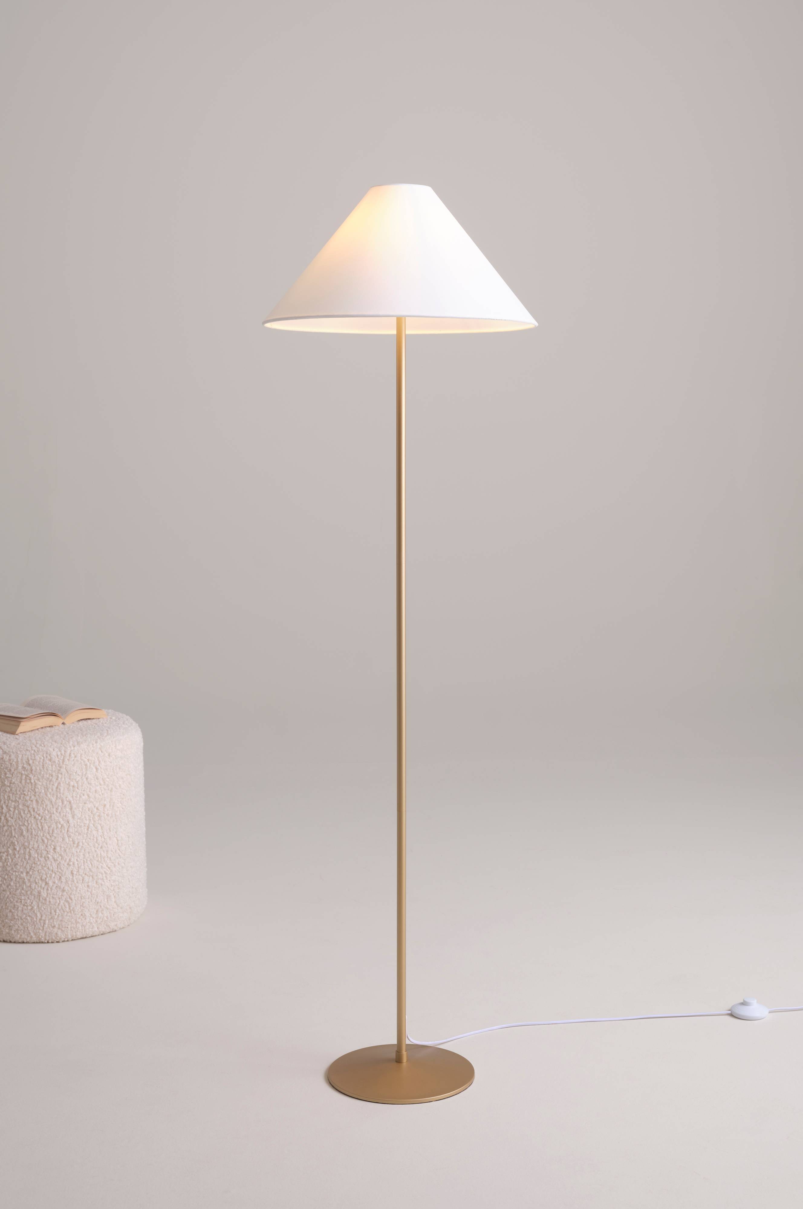 ASTA to stylowa lampa podłogowa z prostą metalową podstawą w eleganckim, matowym złotym kolorze, połączoną ze stożkowym, jasnym kloszem z tkaniny. Klosz ma delikatną, lnianą fakturę i jest rozciągnięty na eleganckiej metalowej ramie, a jego wewnętrzna strona ma błyszczącą powierzchnię, która odbija światło. Biały przewód z wyłącznikiem na przewodzie. Przełącznik należy do modelu, na który należy nastąpić, dzięki czemu włączanie i wyłączanie lampy podłogowej jest niezwykle łatwe.