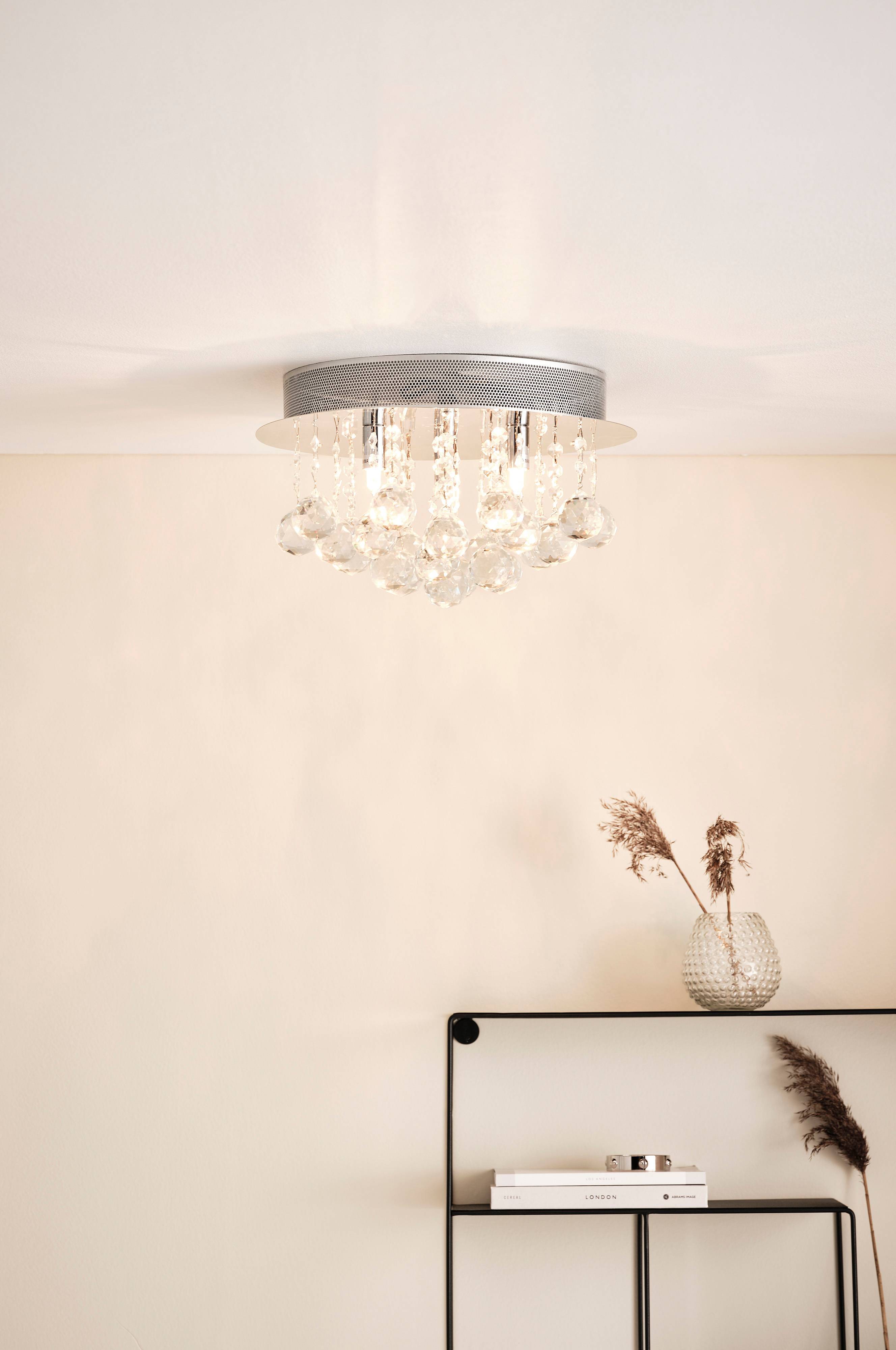 Lampa sufitowa z chromowanego metalu z ozdobnymi kryształowymi pryzmatami i mocowaniem na hak. AVERY to piękna lampa sufitowa, która wniesie do Twojego domu ponadczasową elegancję.