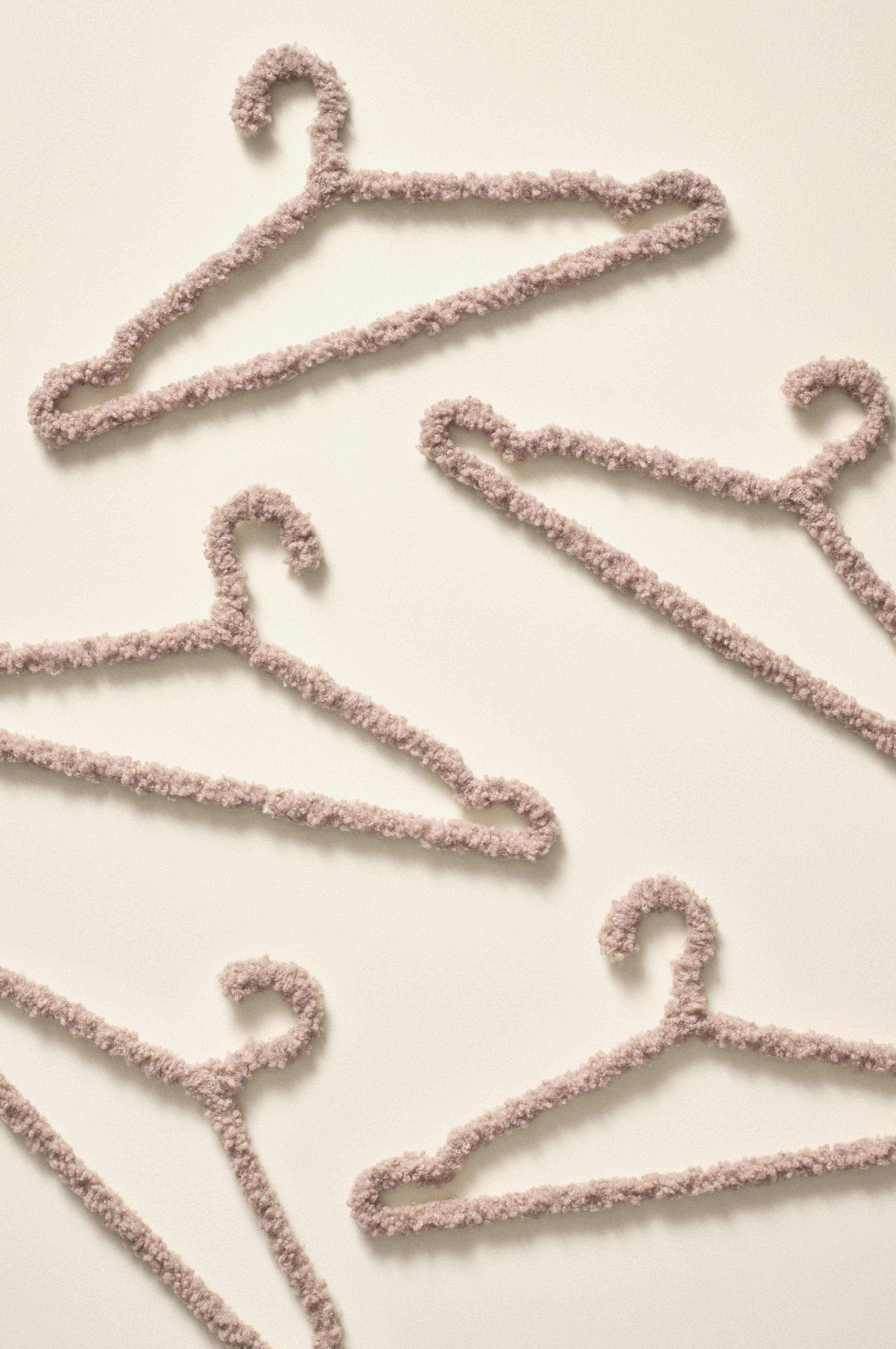 5 wieszaków ze stali nierdzewnej, pokrytych miękkim i przyjemnym poliestrowym pluszem. Wieszaki będą się pięknie prezentować z półką na kapelusze w przedpokoju lub na stojaku na ubrania w sypialni.