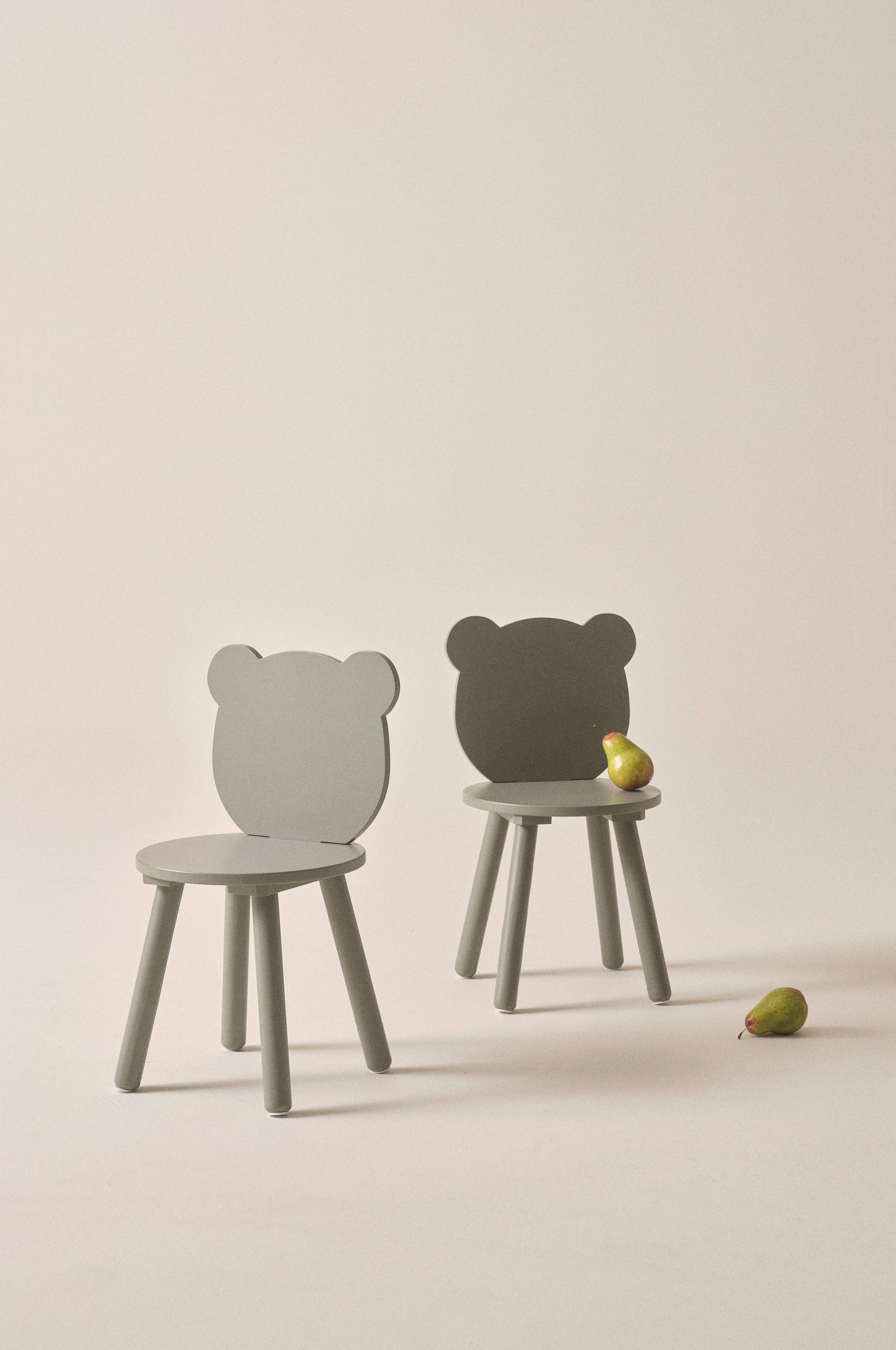 2 krzesła dziecięce z litego drewna sosnowego i MDF pokryte warstwą farby. Okrągłe siedzenie wieńczone jest oparciem w kształcie głowy niedźwiedzia. Szeroko rozstawione zaokrąglone nogi zapewniają lepszą stabilność krzesła, kiedy ktoś zapragnie, na przykład, się na nie wspiąć. Wymaga częściowego montażu. Do produktu dołączona jest instrukcja montażu.