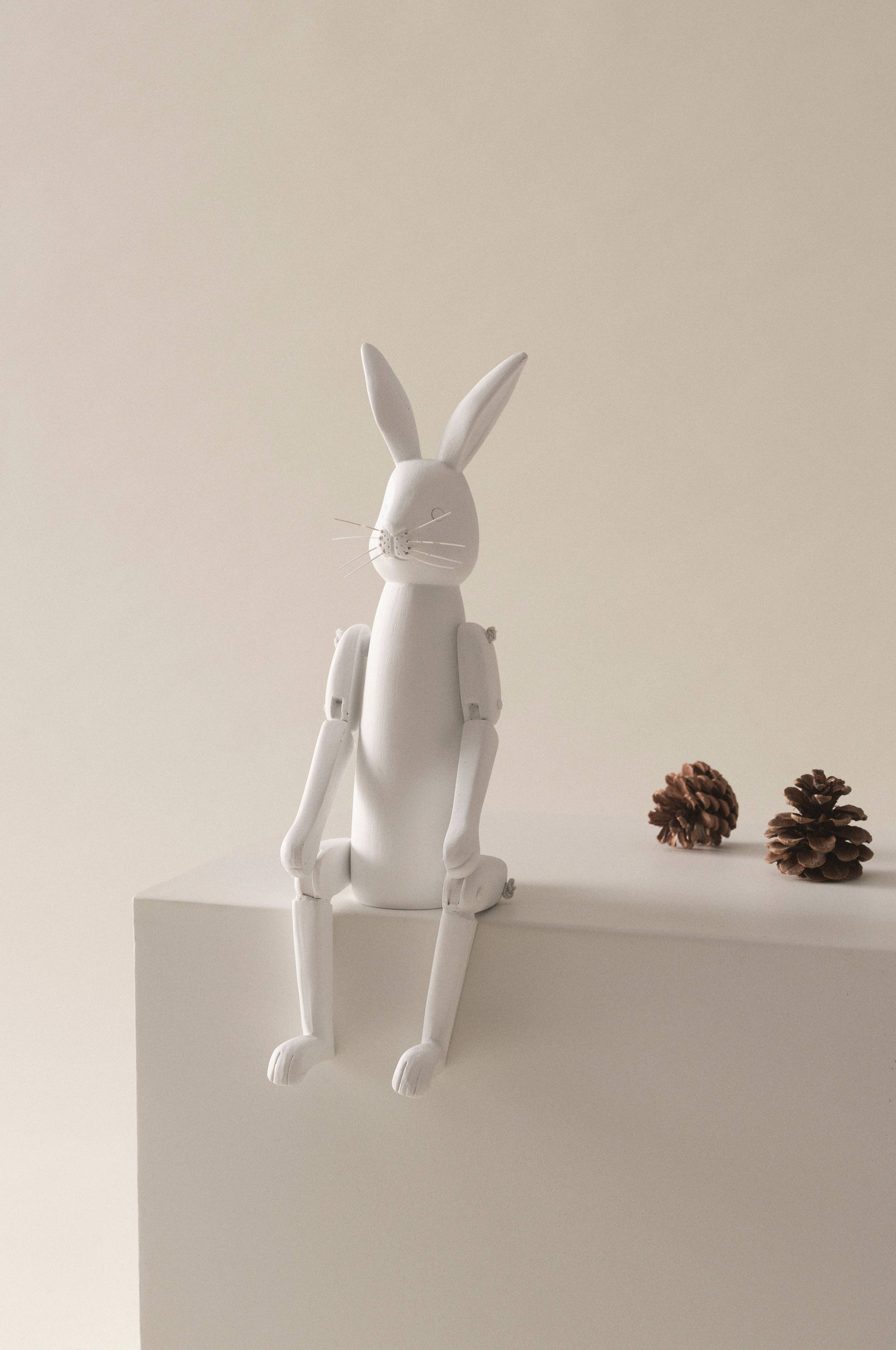 Uroczy króliczek z żywicy epoksydowej, którego można ustawić na krawędzi półki. Ramiona i nogi królika są ruchome.