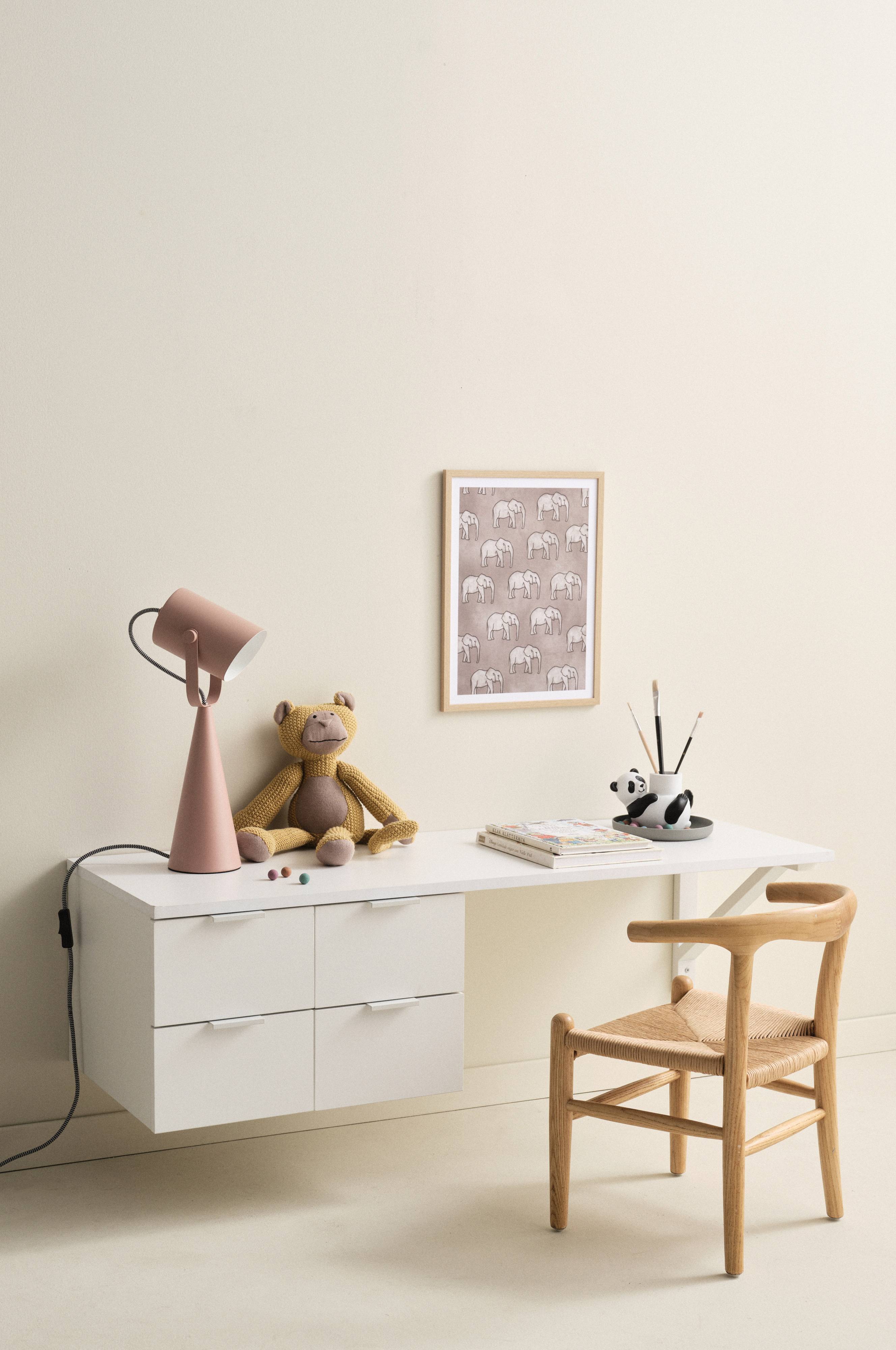 Mocowane do ściany biurko z blatem i szufladami wykonanymi z MFD. Stelaż do zawieszenia wykonano ze stali. Biurko ma z lewej strony cztery szuflady, a prawa strona oparta jest na wsporniku. Mocowania do ściany znajdują się po obu stronach mebla. Wymaga częściowego montażu. Do produktu dołączona jest instrukcja montażu.