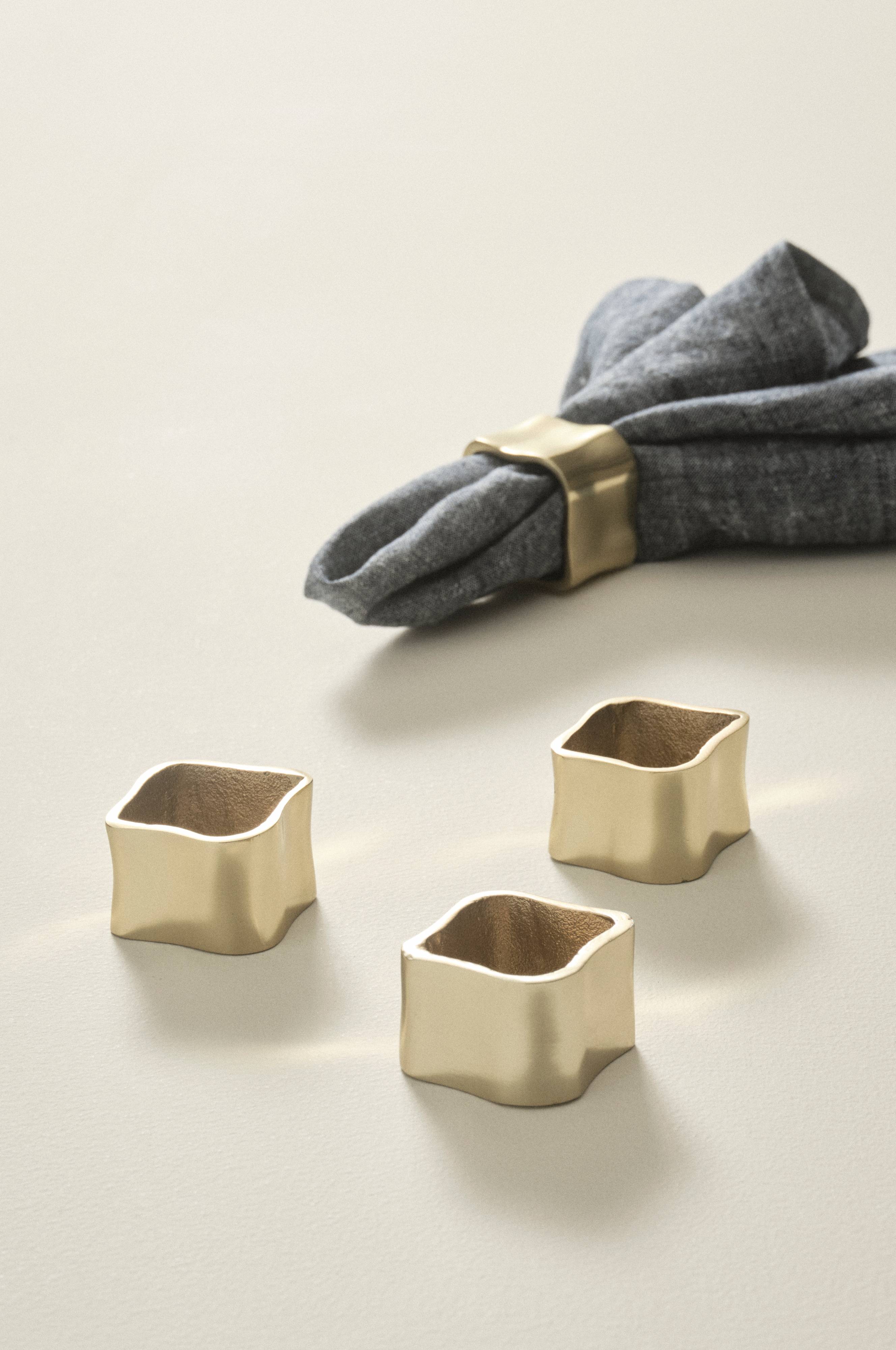 4 obrączki do serwetek wykonane z aluminium. Czworokątne a jednocześnie odznaczające się miękkim kształtem obrączki wraz z materiałowymi serwetkami dodadzą nakryciu elegancji. Obrączki do serwetek zostały pomalowane metodą proszkową.