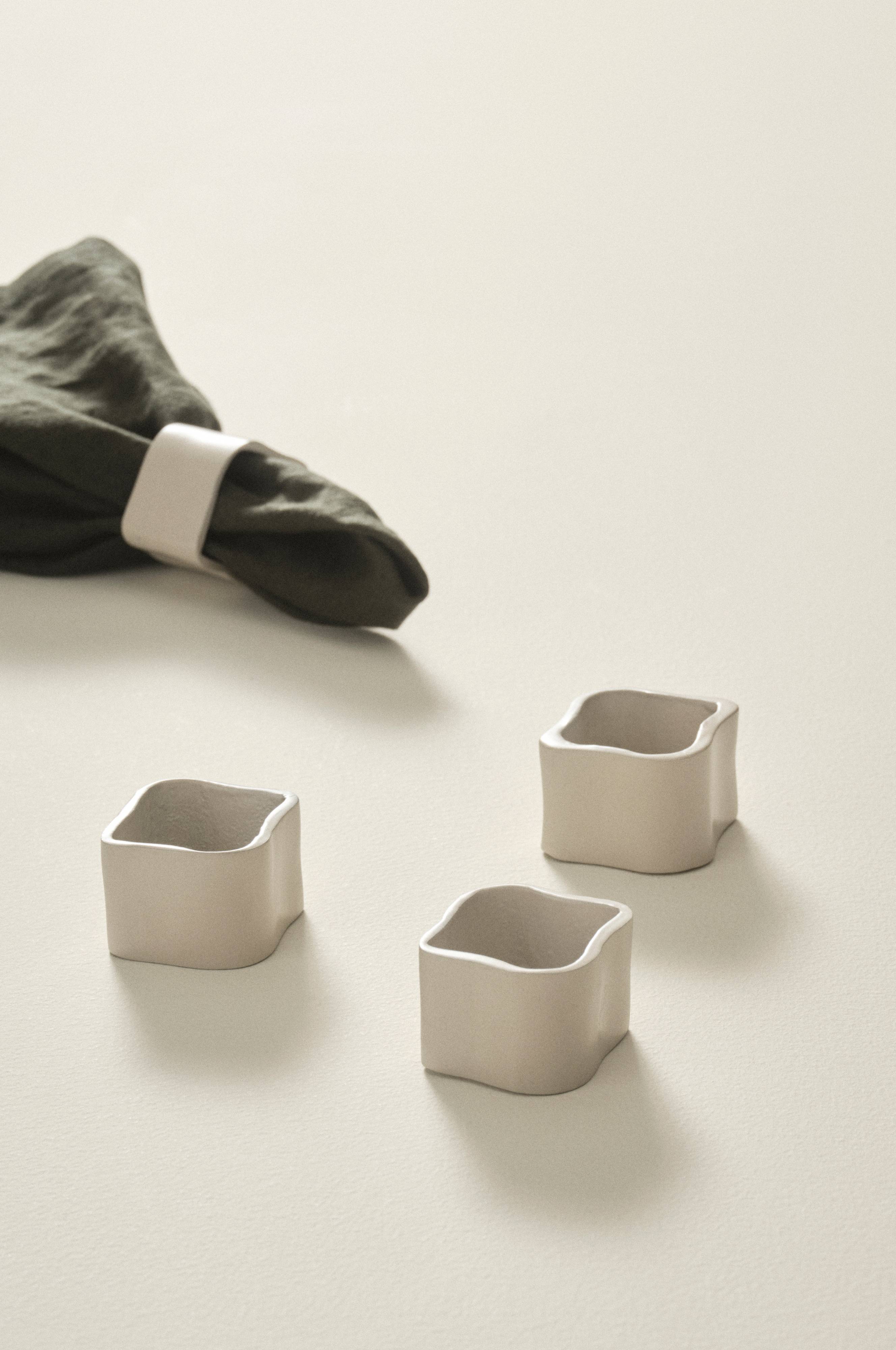 4 obrączki do serwetek wykonane z aluminium. Czworokątne a jednocześnie odznaczające się miękkim kształtem obrączki wraz z materiałowymi serwetkami dodadzą nakryciu elegancji. Obrączki do serwetek zostały pomalowane metodą proszkową.