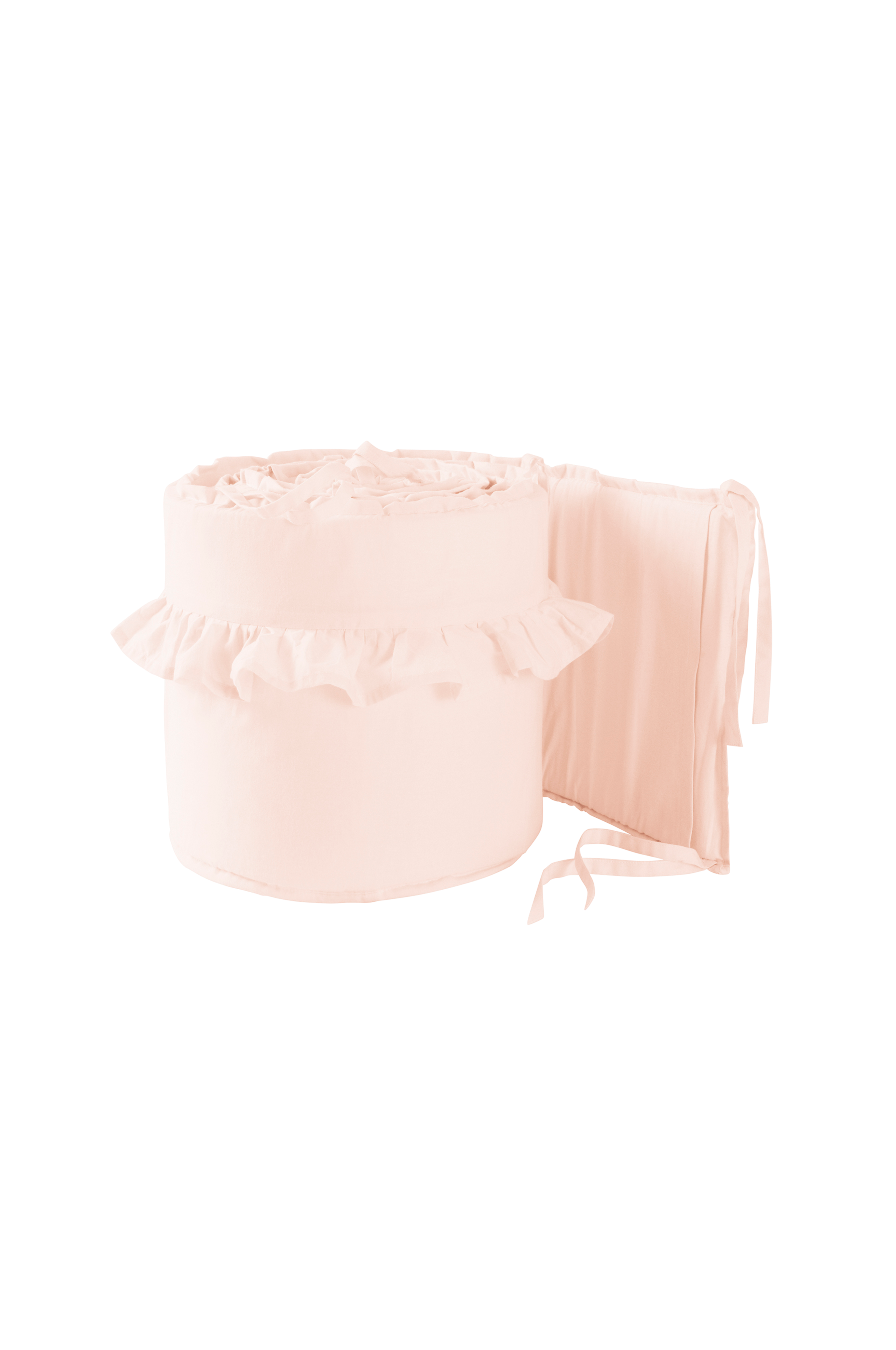Ochraniacz do łóżeczka z materiałem wierzchnim z ekologicznej bawełny, wypełnieniem z gumy piankowej oraz z ozdobną falbaną. Ochraniacz sprawia, że łóżeczko jest przyjemne i bardziej przytulne, a jednocześnie chroni dziecko przed uderzeniem się o szczebelki podczas snu. Mocowanie ochraniacza za pomocą troczków. Materiał wierzchni można zdejmować i prać.