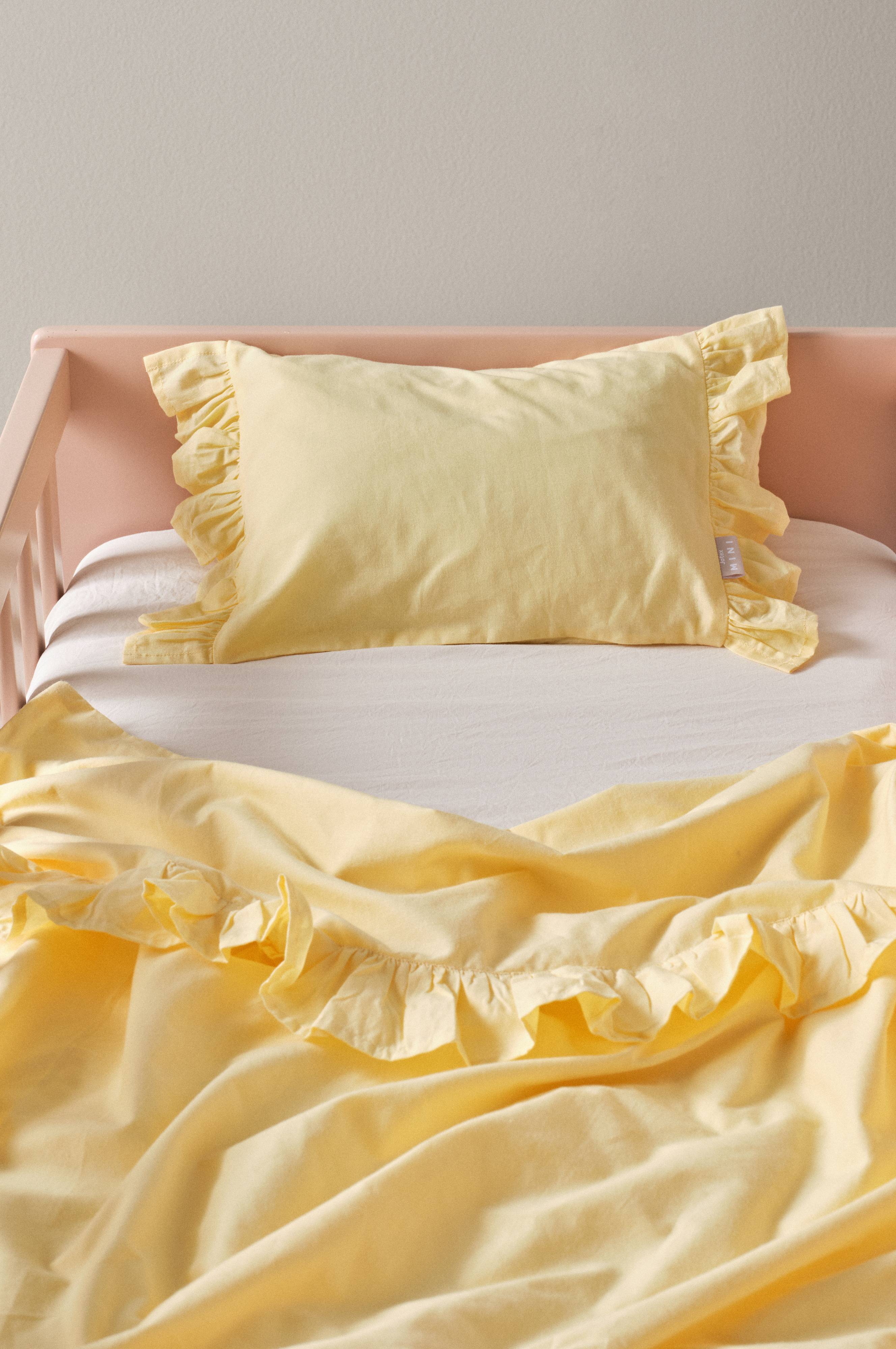 Poszewka na poduszkę z ekologicznej bawełny obszyta dekoracyjną falbaną. Pościel z bawełny jest przewiewna i delikatna dla ciała. Poszewka na poduszkę sprawdzi się dla małych dzieci i będzie idealna do łóżeczka dla niemowląt. Gęstość splotu materiału wynosi 144 TC. (Gęstość splotu materiału oznacza ilość przeplecionych ze sobą nici, thread count, na cal kwadratowy materiału. Im wyższa gęstość tym lepsza jakość).