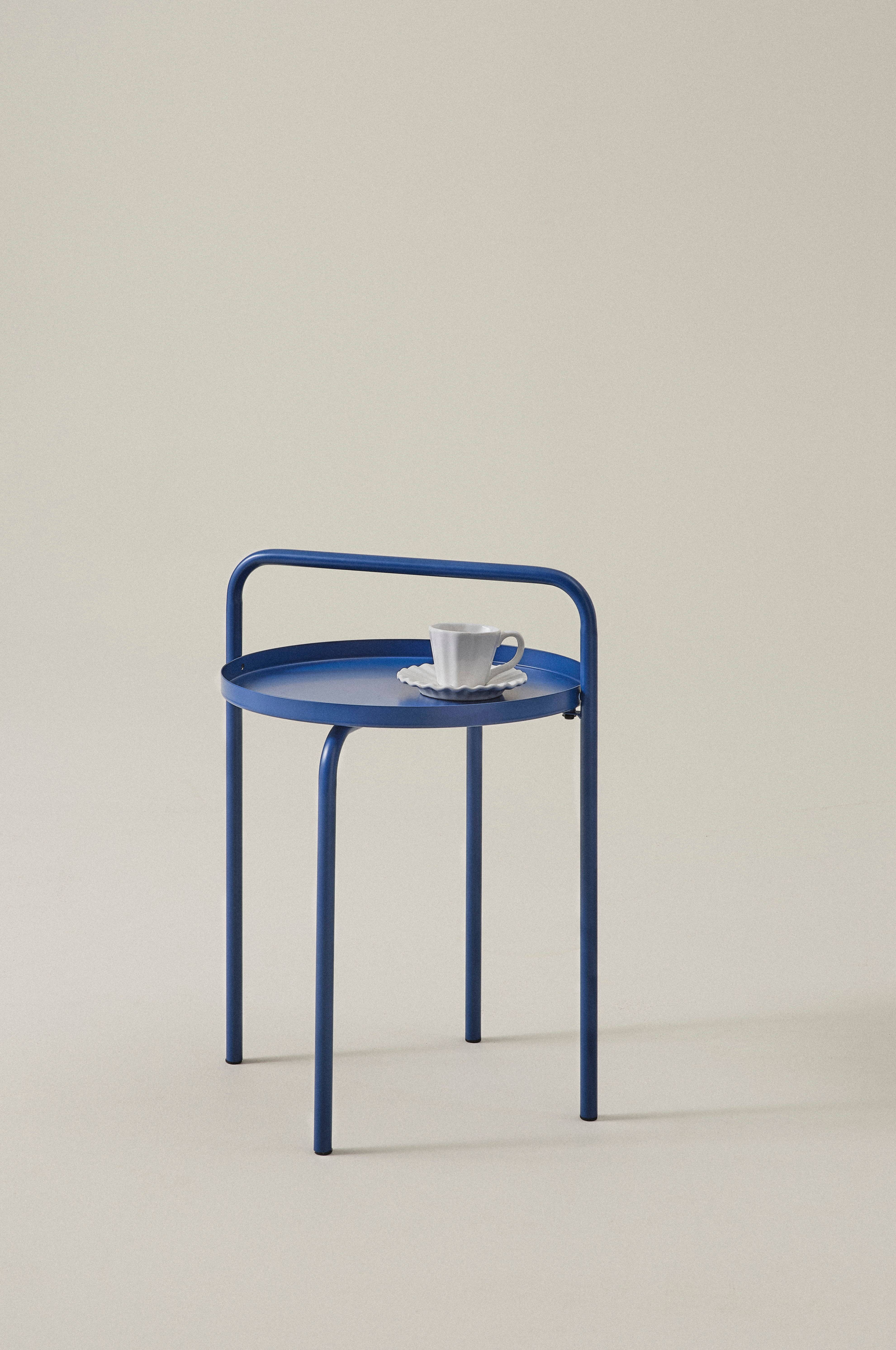 Okrągły stół z lakierowanego proszkowo metalu. Uroczy stolik z wygodnym uchwytem. Oprzyj o uchwyt książkę lub tablet, aby móc zająć się robótką lub słodyczami.