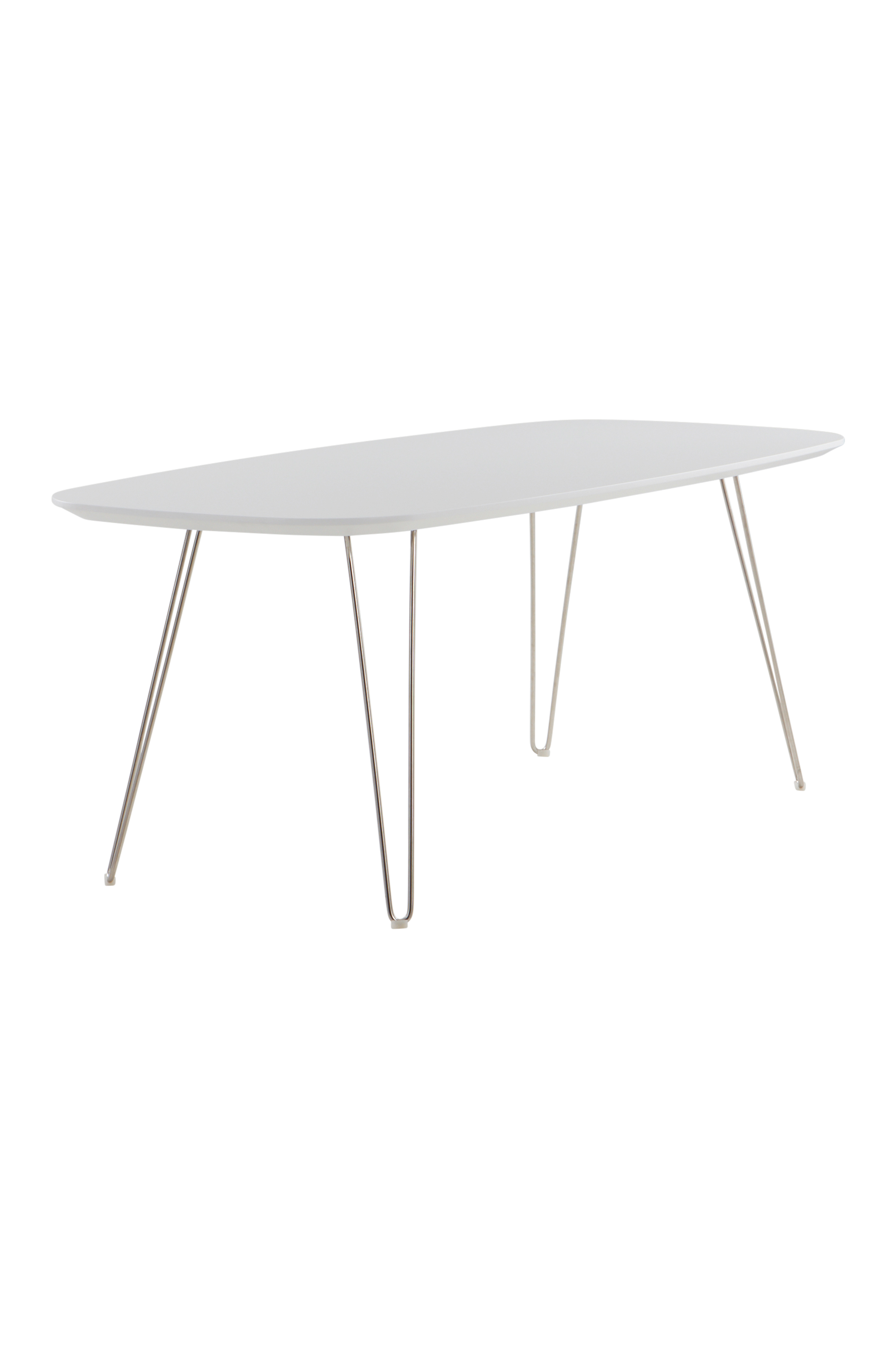 Prostokątny stół o stylowym designie. Stół w kolorze naturalnym lub czarnym, którego nogi wykonane są z lakierowanego na czarno żelaza, a blat pokrywa jesionowy fornir z pięknymi słojami. Blat stołu w kolorze białym wykonany jest z lakierowanej płyty MDF, a nogi ze stali nierdzewnej. Mimo swoich pokaźnych rozmiarów, stół ma lekki i smukły wygląd za sprawą blatu o pięknym kształcie i stalowych nóg. Wymaga częściowego montażu. Do produktu dołączona jest instrukcja montażu. Śruby w zestawie.