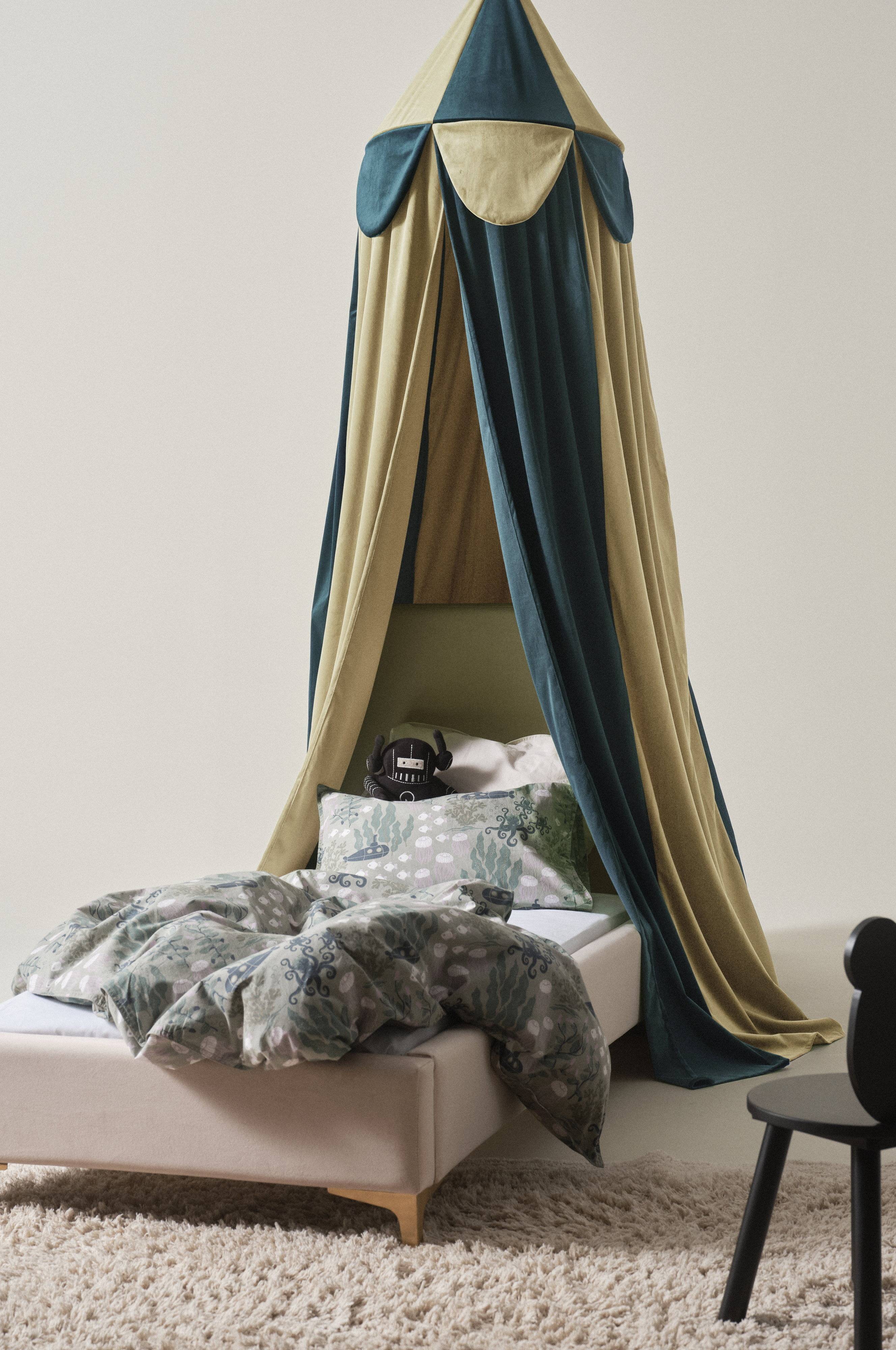 BLOCK to baldachim wykonany z dwukolorowego aksamitu. Tkaninę wykonano z poliestru, który w połowie pochodzi z recyklingu. U góry baldachimu znajduje się ukryta obręcz, którą można wyjąć, gdy tylko nadejdzie pora, żeby wyprać baldachim. W tym modelu przód i tył baldachimu nie są zasłonięte, co może być zaletą dla tych, którzy wolą zamontować nocną lampkę na ścianie za łóżkiem. Dzięki materiałowej pętli przyszytej u góry, z łatwością zawiesisz baldachim na haku sufitowym w pokoju dziecięcym i stworzysz przytulną i ciepłą atmosferę wokół łóżka swojej pociechy.