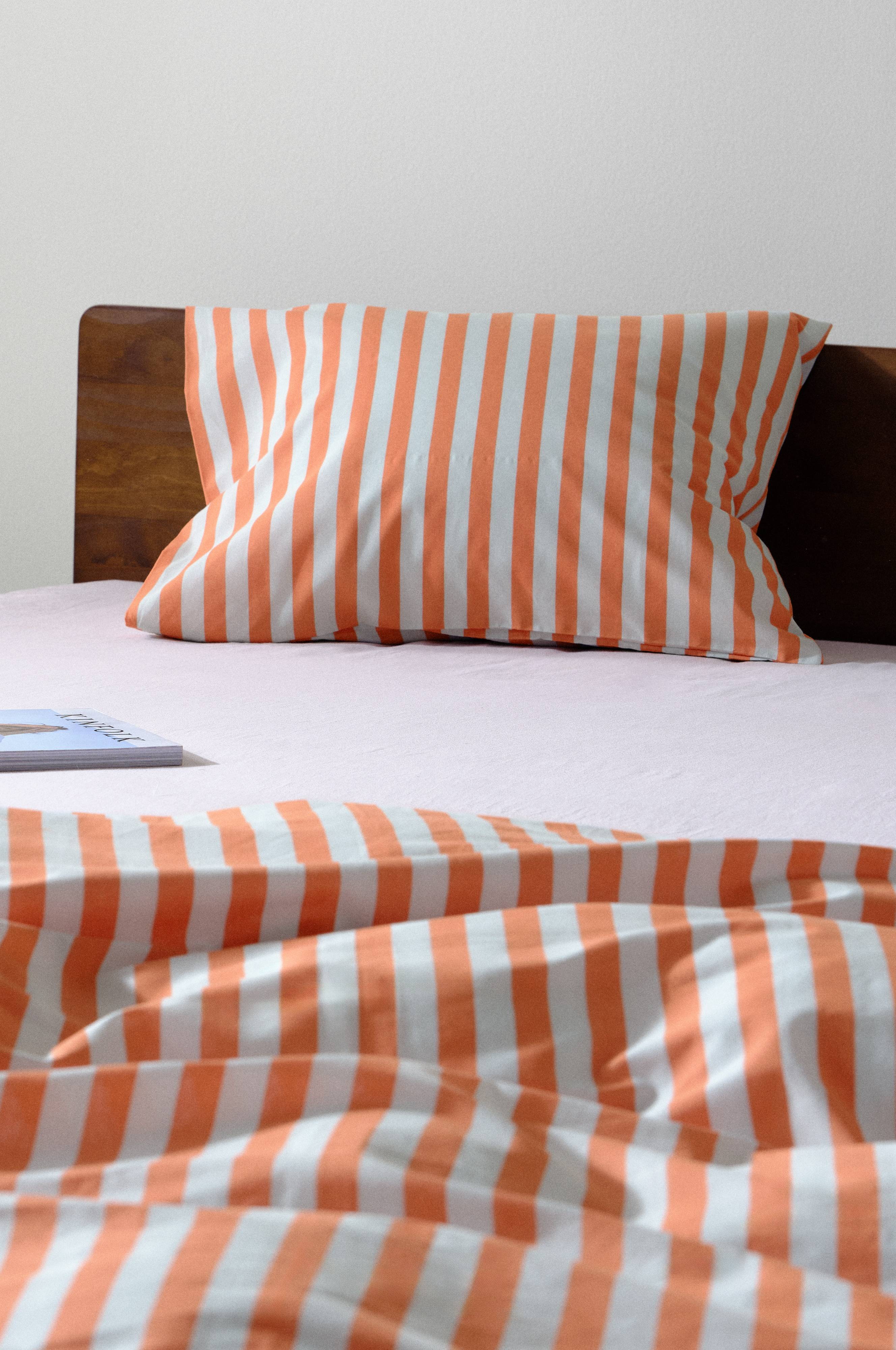 Poszewka na poduszkę wykonana z ekologicznej bawełny ze wzorem wąskich pasków. Klasyczne paski będą pasować zarówno młodszym jak i starszym. Tkanina jest przyjemna w dotyku, ponieważ bawełna jest chłodna i przyjemna dla skóry, dlatego chęć wślizgnięcia się do świeżo pościelonego łóżka jest nieodparta. Wzór pasków został nadrukowany w czystych, radosnych kolorach przełamanych co drugi pasek kolorem białym. Gęstość splotu materiału wynosi 144 TC. (Gęstość splotu materiału oznacza ilość przeplecionych ze sobą nici, thread count, na cal kwadratowy materiału. Im wyższa gęstość tym lepsza jakość.)