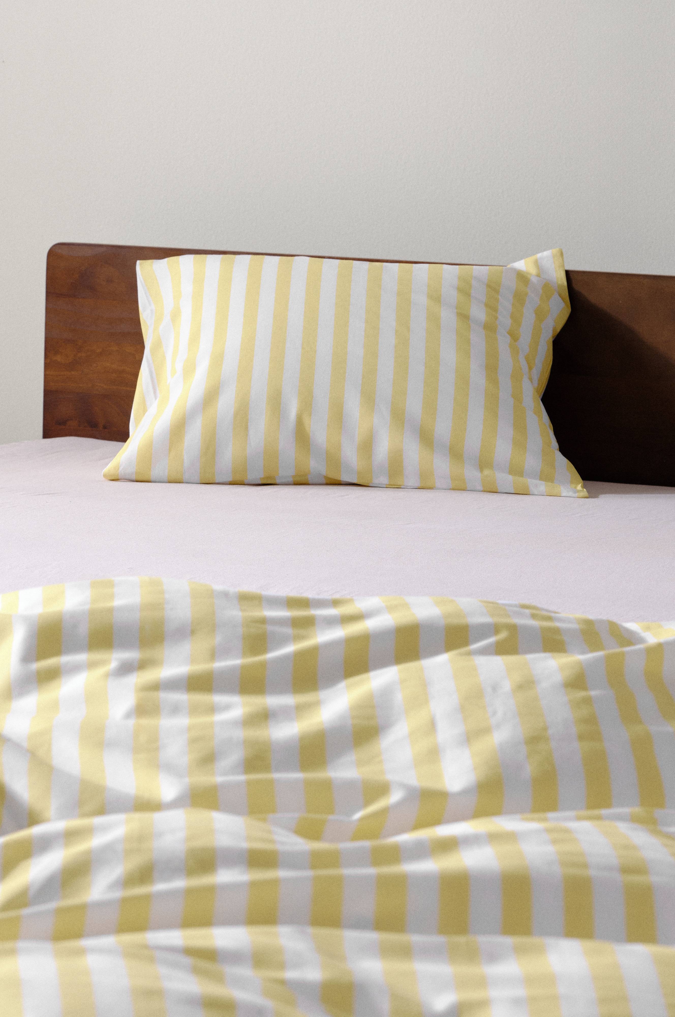 Poszewka na poduszkę wykonana z ekologicznej bawełny ze wzorem wąskich pasków. Klasyczne paski będą pasować zarówno młodszym jak i starszym. Tkanina jest przyjemna w dotyku, ponieważ bawełna jest chłodna i przyjemna dla skóry, dlatego chęć wślizgnięcia się do świeżo pościelonego łóżka jest nieodparta. Wzór pasków został nadrukowany w czystych, radosnych kolorach przełamanych co drugi pasek kolorem białym. Gęstość splotu materiału wynosi 144 TC. (Gęstość splotu materiału oznacza ilość przeplecionych ze sobą nici, thread count, na cal kwadratowy materiału. Im wyższa gęstość tym lepsza jakość.)