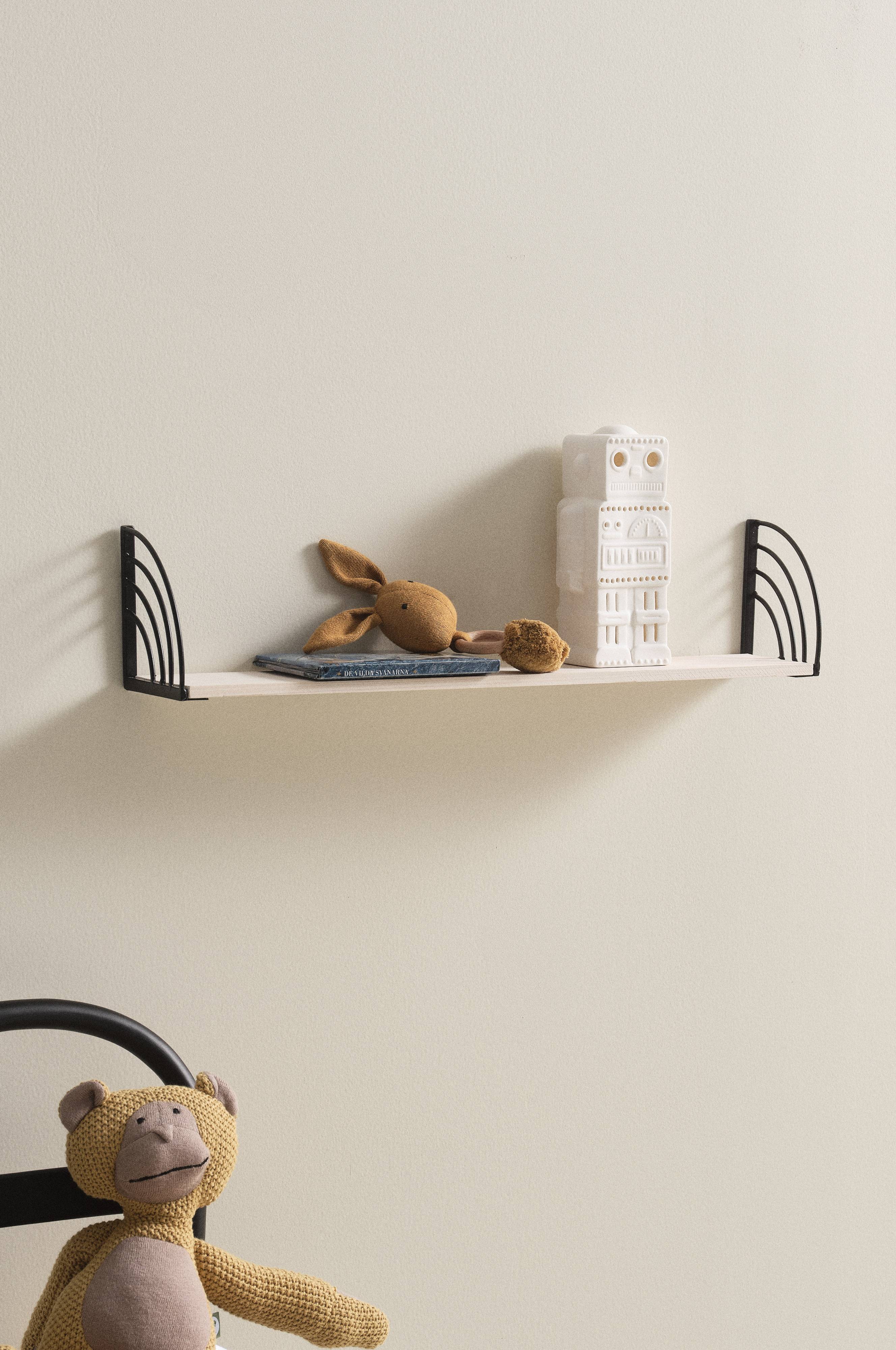 Ręcznie wykonana półka ścienna z żelaznymi bokami i półką z drewna świerkowego. Subtelne boki w kształcie tęczy po obu stronach bielonej półki sprawiają, że BOGLIA doskonale nadaje się do pokoju dziecięcego. Otwór do zawieszenia w górnej części.
