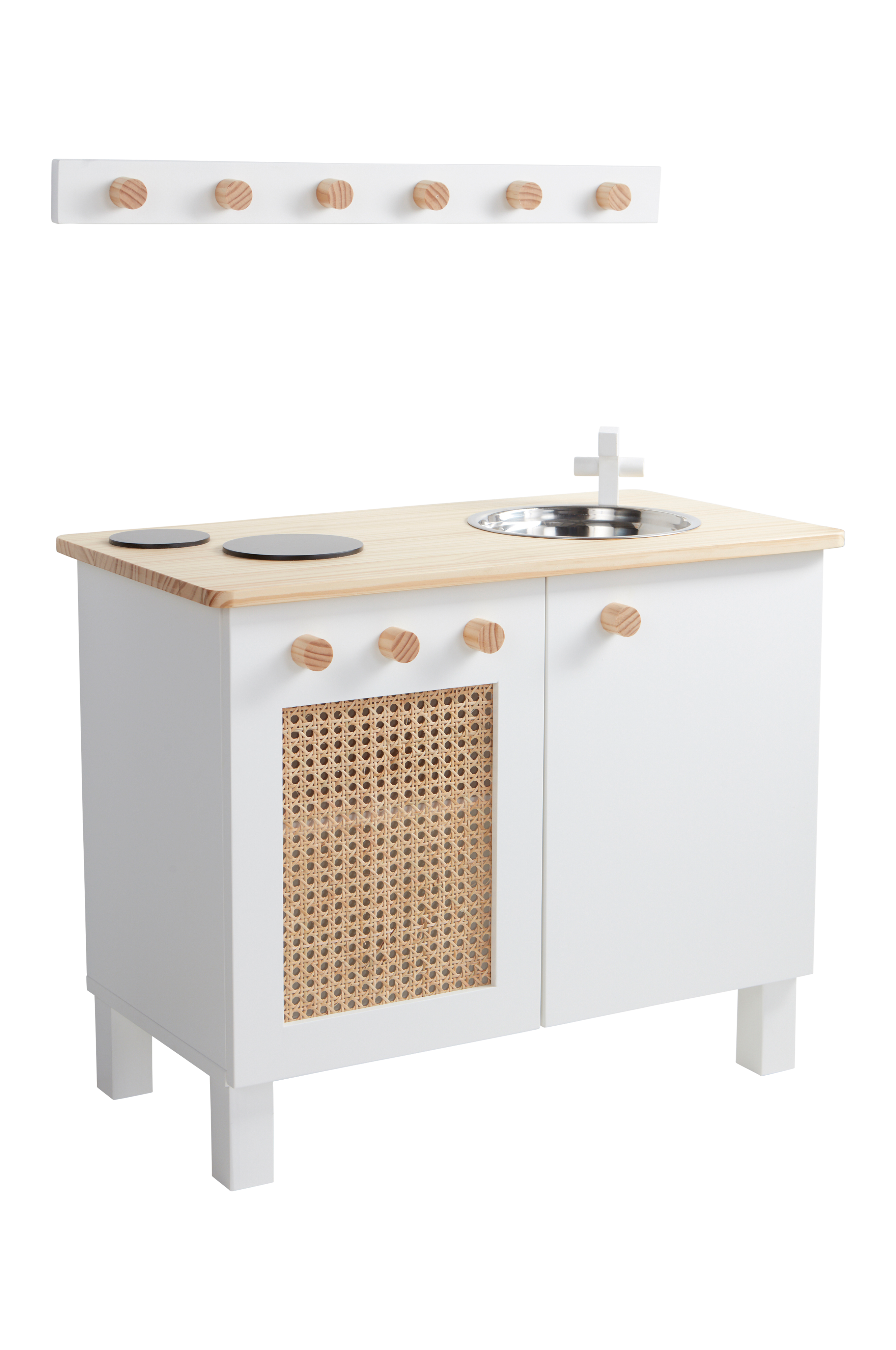 Kuchnia dziecięca wykonana z malowanej płyty MDF z blatem z surowego drewna sosnowego oraz z rattanową kratką w jednym z prześwitów. Kuchnia ma dwa palniki i zlew z drewnianym kranem. Obie szafki są otwierane, z dodatkową półką w każdej z nich. Do kuchni dołączono listwę z 6 gałkami. Wszystkie gałki, zarówno te na szafce, jak i na listwie, wykonano z drewna sosnowego. Produkt posiada oznaczenie CE zapewniające, że zabawka spełnia wymagania regulacji UE. Produkt dla dzieci powyżej 3 lat. Produkt wymaga montazu. Do produktu dołączona jest instrukcja montażu.