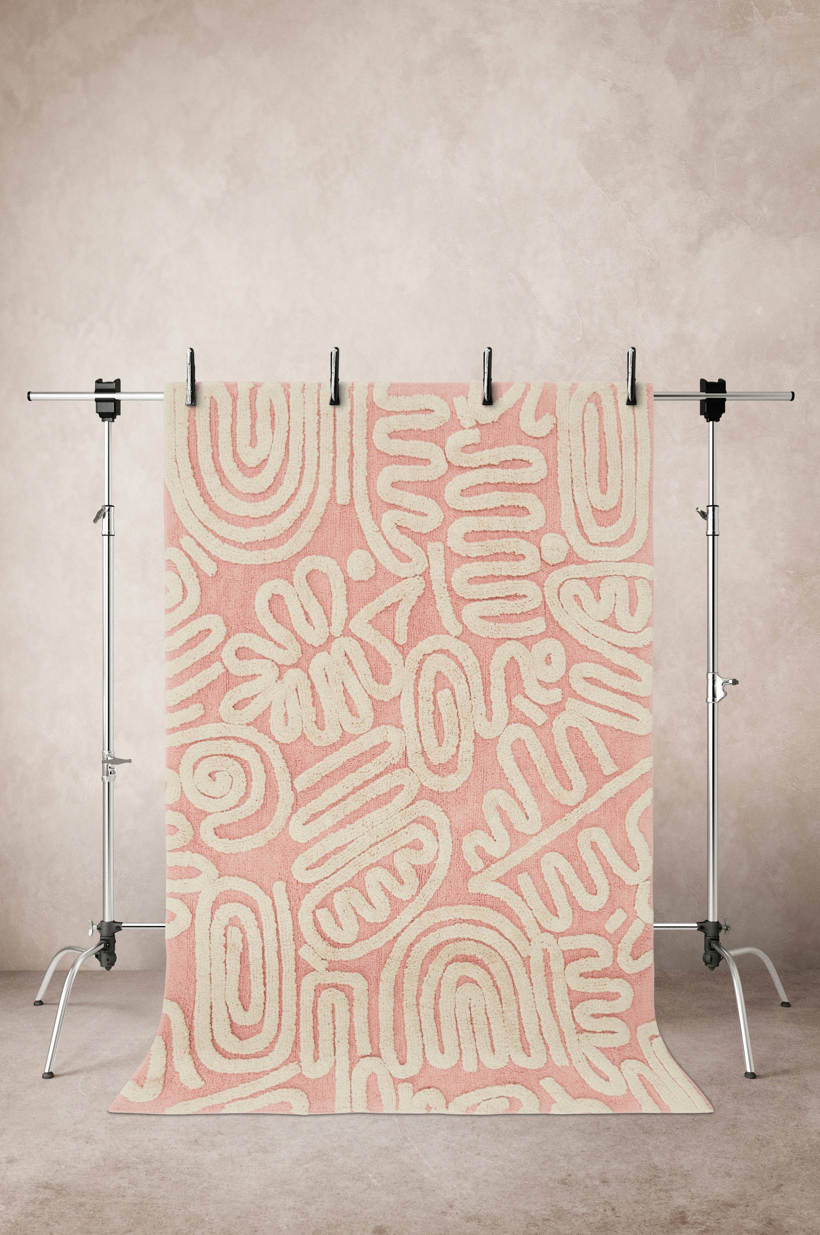 Tuftowany dywan, którego barwiona przędza tworzy wzór w gustownych i jasnych kształtach na różowym spodzie. Dzięki różnej wysokość runa wzór ten zyskuje głębię. Dywan jest miękki i wygodnie będzie na nim usiąść i spędzić czas na zabawie. Wysokość krótkiego runa 1-1,1 cm, długiego 1,3-1,4 cm. Grubość 1,4-1,5 cm. 1900-2000 g/m².