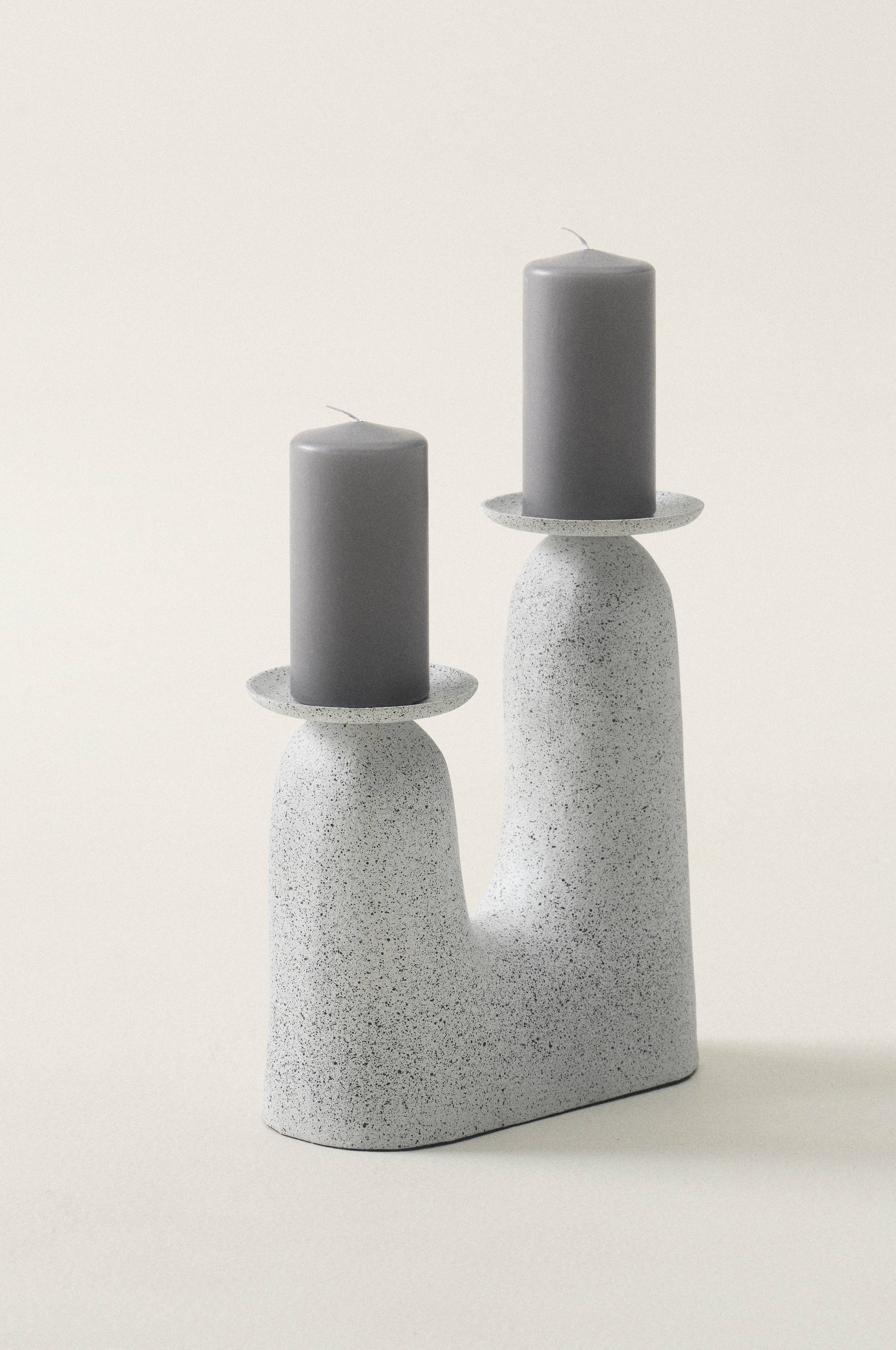 Aluminiowy świecznik o matowym, delikatnie chropowatym wykończeniu. Świecznik odznacza się miękkimi liniami i posiada uchwyt na dwie świece, w którym zmieszczą się świece bryłowe lub podgrzewacze tealight. Świece sprzedawane są osobno.