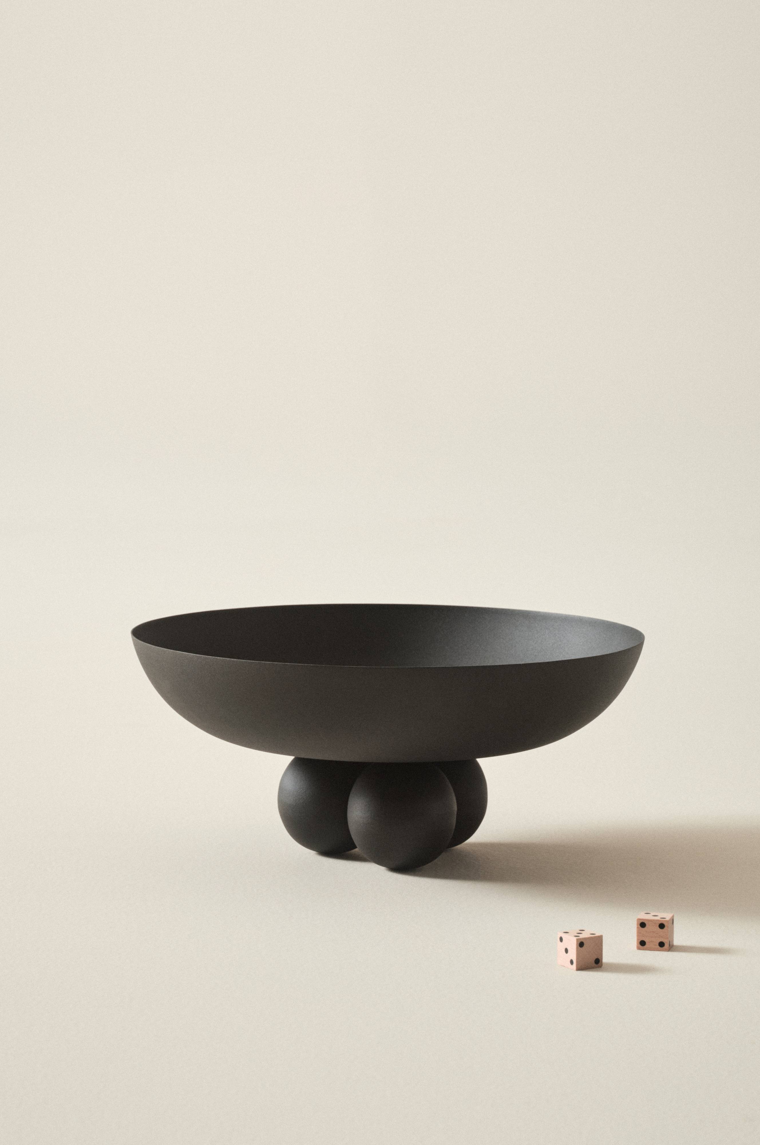 Dekoracyjna misa wykonana z żelaza o matowej powierzchni. Misa stoi na trzech nóżkach w kształcie kul, które kontrastują z cienkimi ściankami misy.