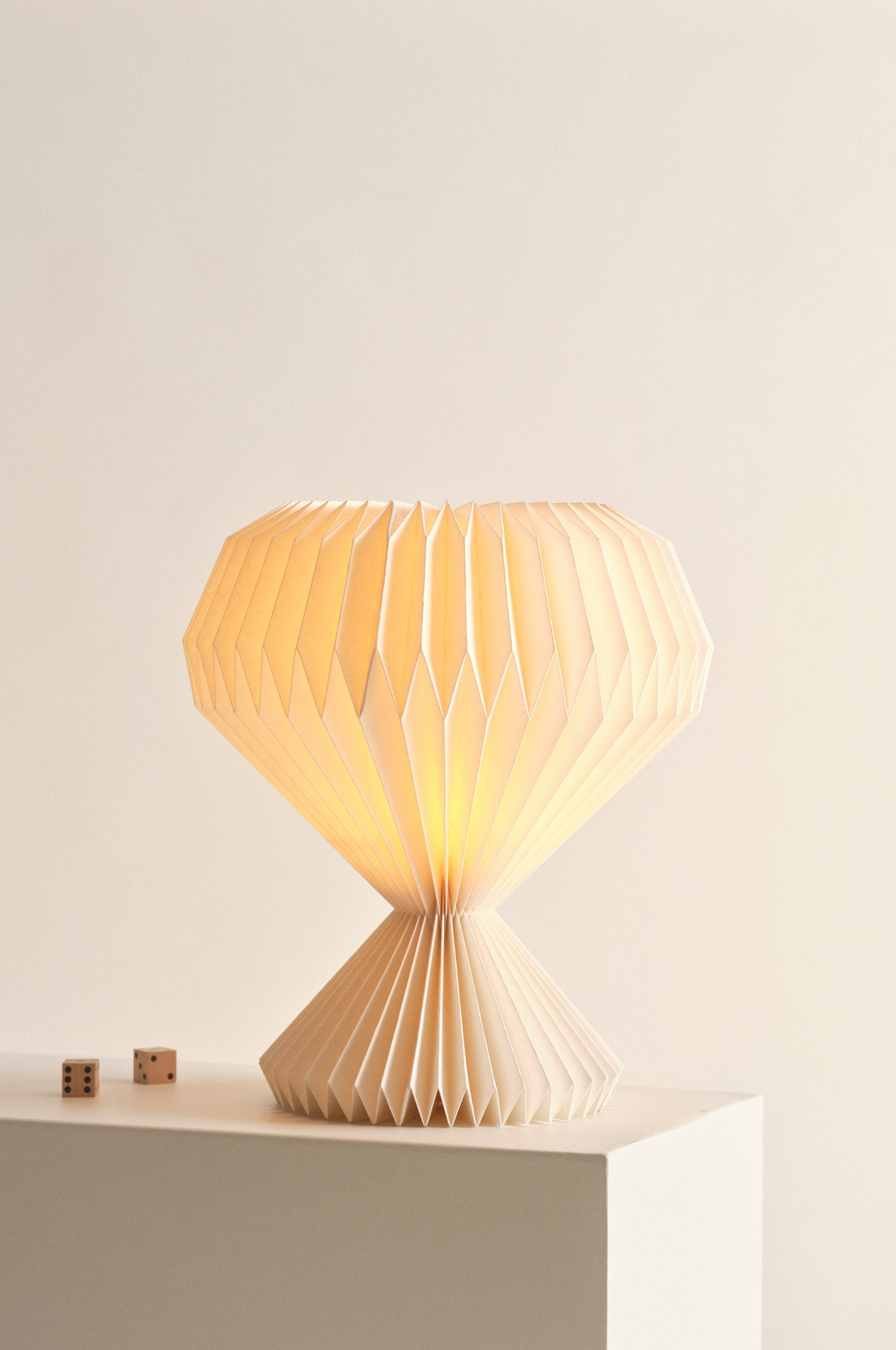 Lampa stołowa z karbowanego papieru z dekoracyjnym, czarnym przewodem w tekstylnym oplocie. Lampa roztacza w pomieszczeniu przyjemne, przytłumione światło. Przełącznik został umieszczony na przewodzie.