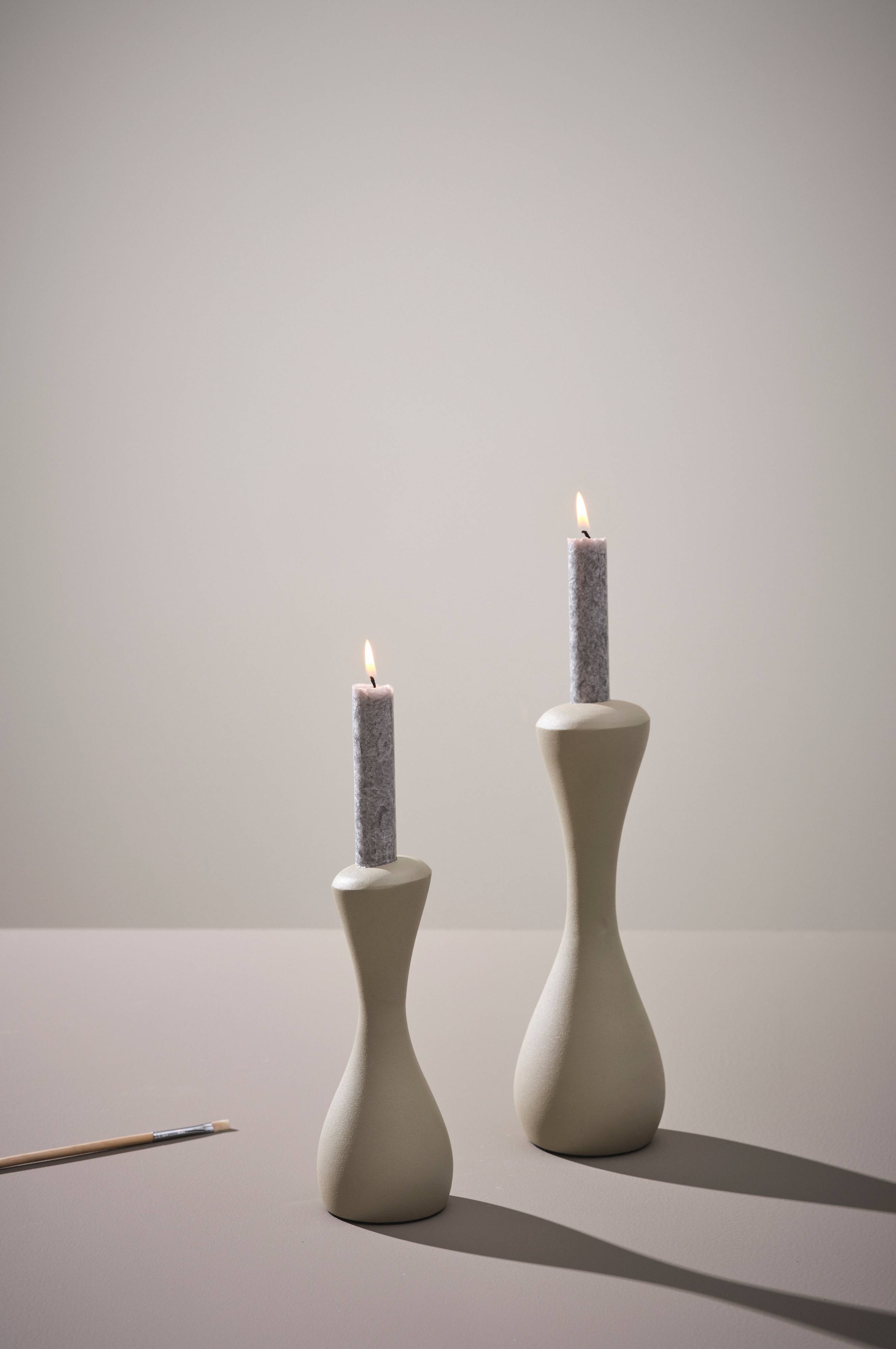2 aluminiowe lichtarze z delikatną fakturą, pokryte kolorowym lakierem. Lekko zaokrąglone świeczniki uzupełniają się pod względem rozmiaru, ponieważ jeden jest nieco większy a drugi nieco mniejszy. CAMEO to ponadto wybór, który chroni przed zaprószeniem ognia.