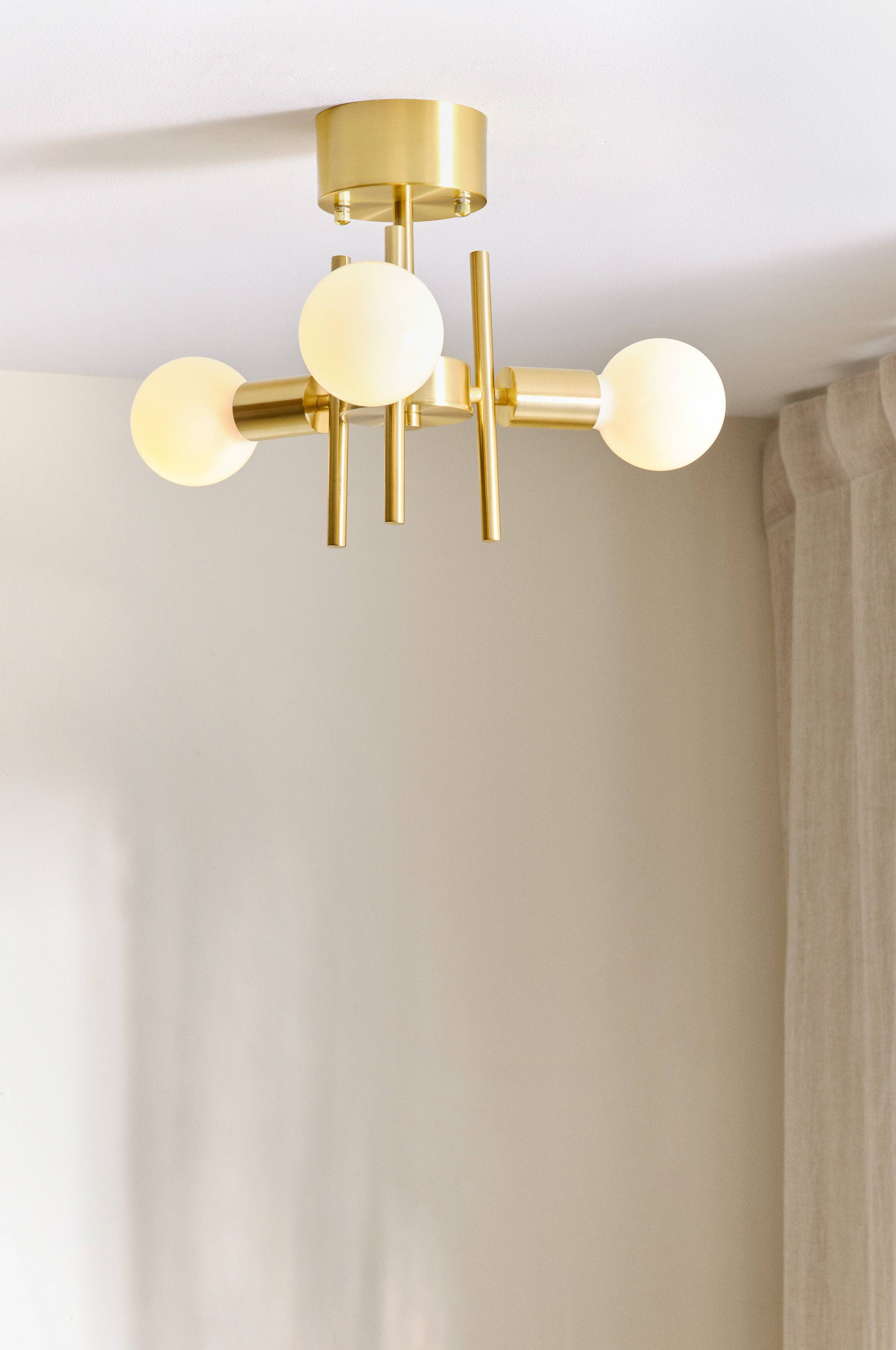 Metalowa lampa sufitowa z trzema punktami świetlnymi. Żarówka sprzedawana oddzielnie. Kołek sufitowy nie wchodzi w skład zestawu ze względu na nowe regulacje unijne. Produkt o nazwie ROOF EARTH, kołek sufitowy, dostępny jest osobno.