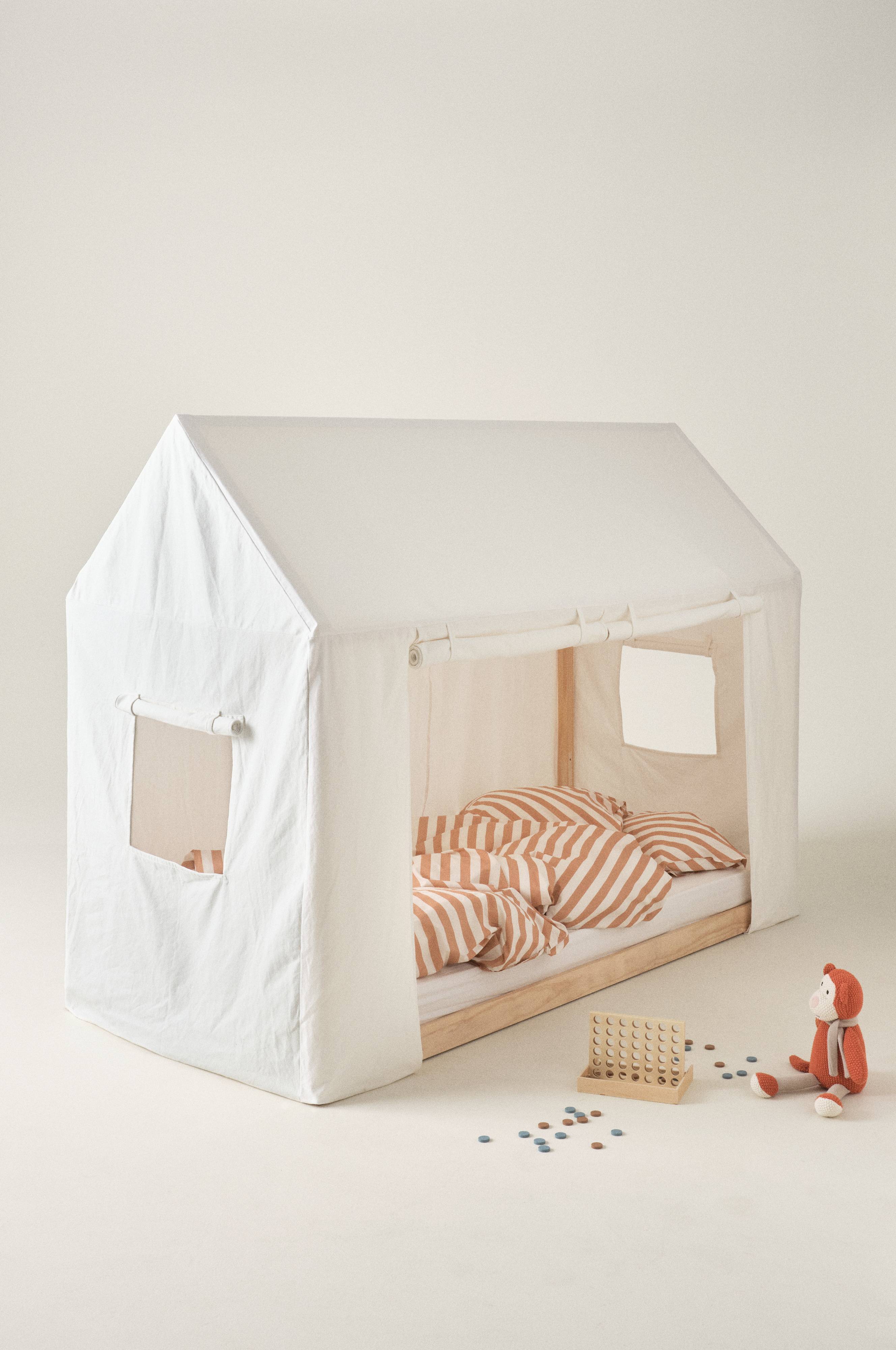 Namiot z płótna bawełnianego, pasuje idealnie do łóżka dziecięcego CASTILLO. Połącz namiot i łóżko, a zyskasz przytulne posłanie, w którym można się schować i zasnąć. Namiot jest dopasowany do stelaża, wystarczy go naciągnąć i zapiąć na rzep. Po obu stronach znajdują się urocze małe okienka, a dodatkowo namiot ma dwa zwijane do góry wejścia. W wygodnym łóżku nawet układanie się do snu jest zabawą, bo kto chciałby się nudzić? Z namiotem łóżko zamienia się w domek do zabawy, a także zapewnia niezapomniane wrażenie spania w prawdziwym namiocie.