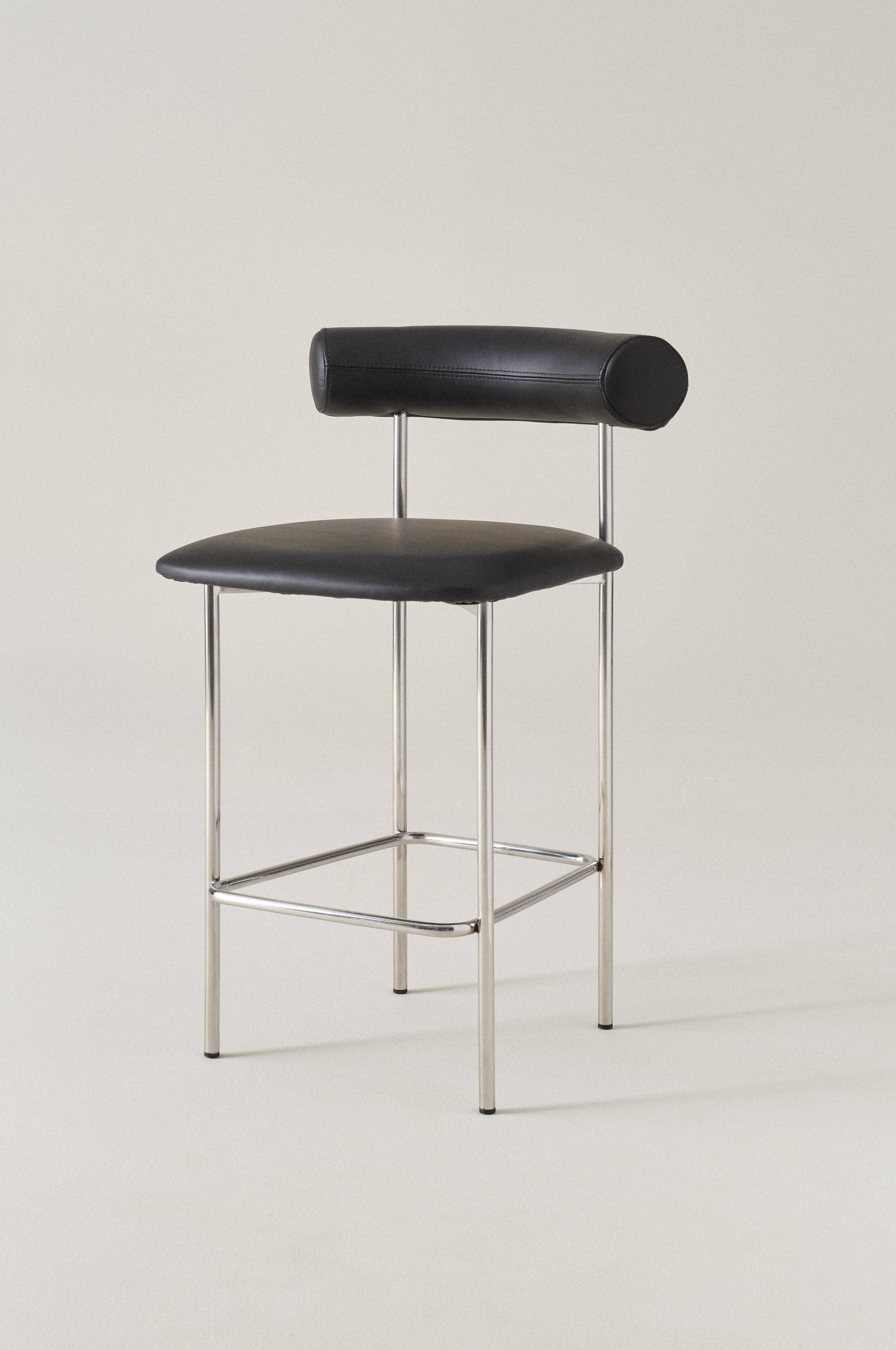 Krzesło barowe ze stylową skórzaną tapicerką w gustownym połączeniu z chromowaną stalą. Siedzisko i miękkie, zaokrąglone oparcie są miękko wyściełane, co sprawia, że krzesło jest wygodne do siedzenia, idealne na długie, przyjemne posiłki. Rama fotela wykonana jest ze sklejki posiadającej certyfikat FSC. Skóra to trwały materiał, który w razie potrzeby możesz łatwo wytrzeć.