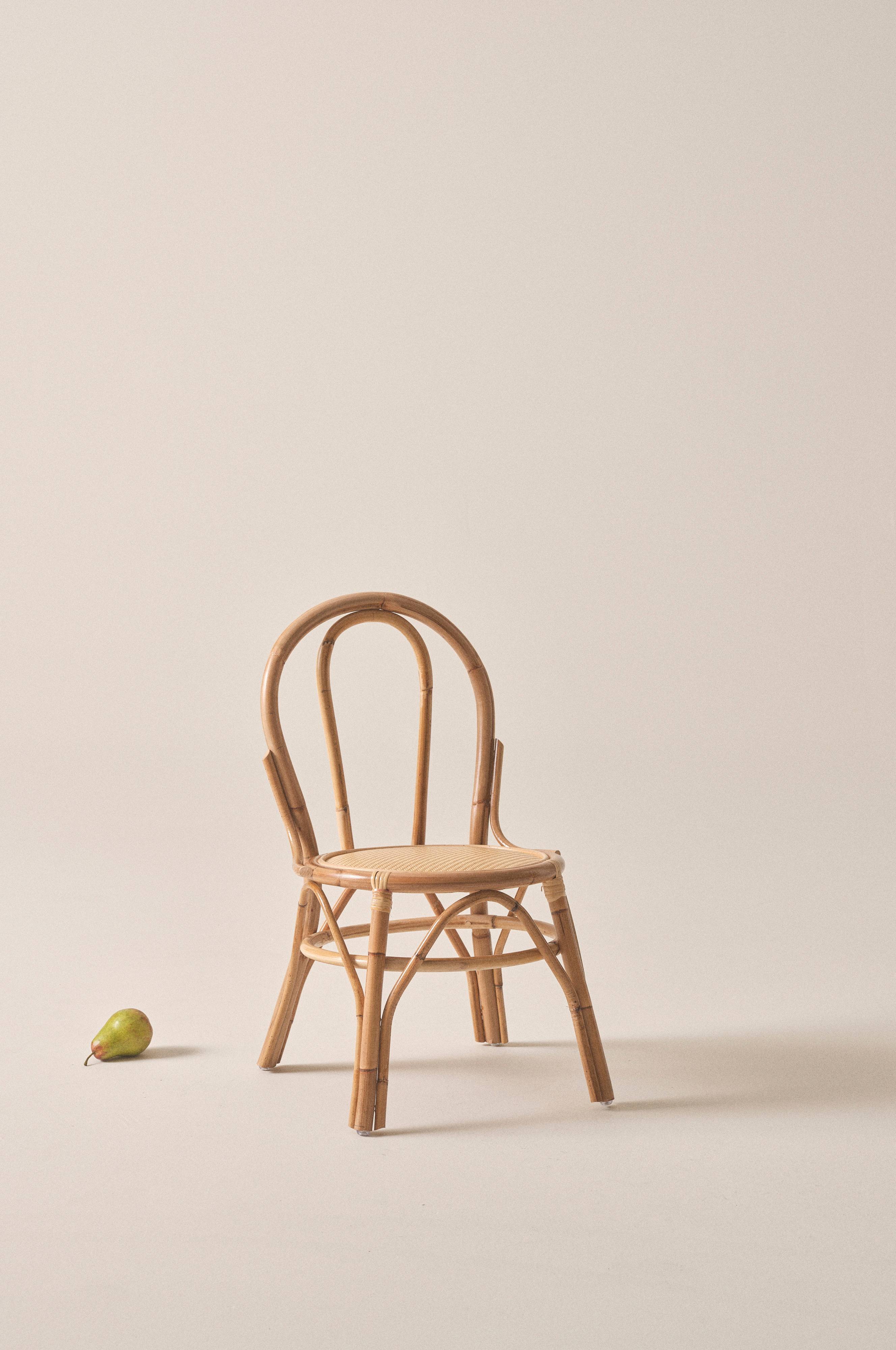Ręcznie wykonane z rattanu krzesło dziecięce, pociągnięte lakierem na bazie wody, który zapewnia naturalną powierzchnię i kolor, podkreślając wspaniały charakter rattanu. Krzesło prezentuje klasyczny model kawiarniany, będąc przy tym normalnym krzesłem w mniejszym formacie. Idealne dla dzieci, by usiąść na krześle o dopasowanej wysokości. Ręczne wykonanie sprawia, że każde krzesło jest wyjątkowe.