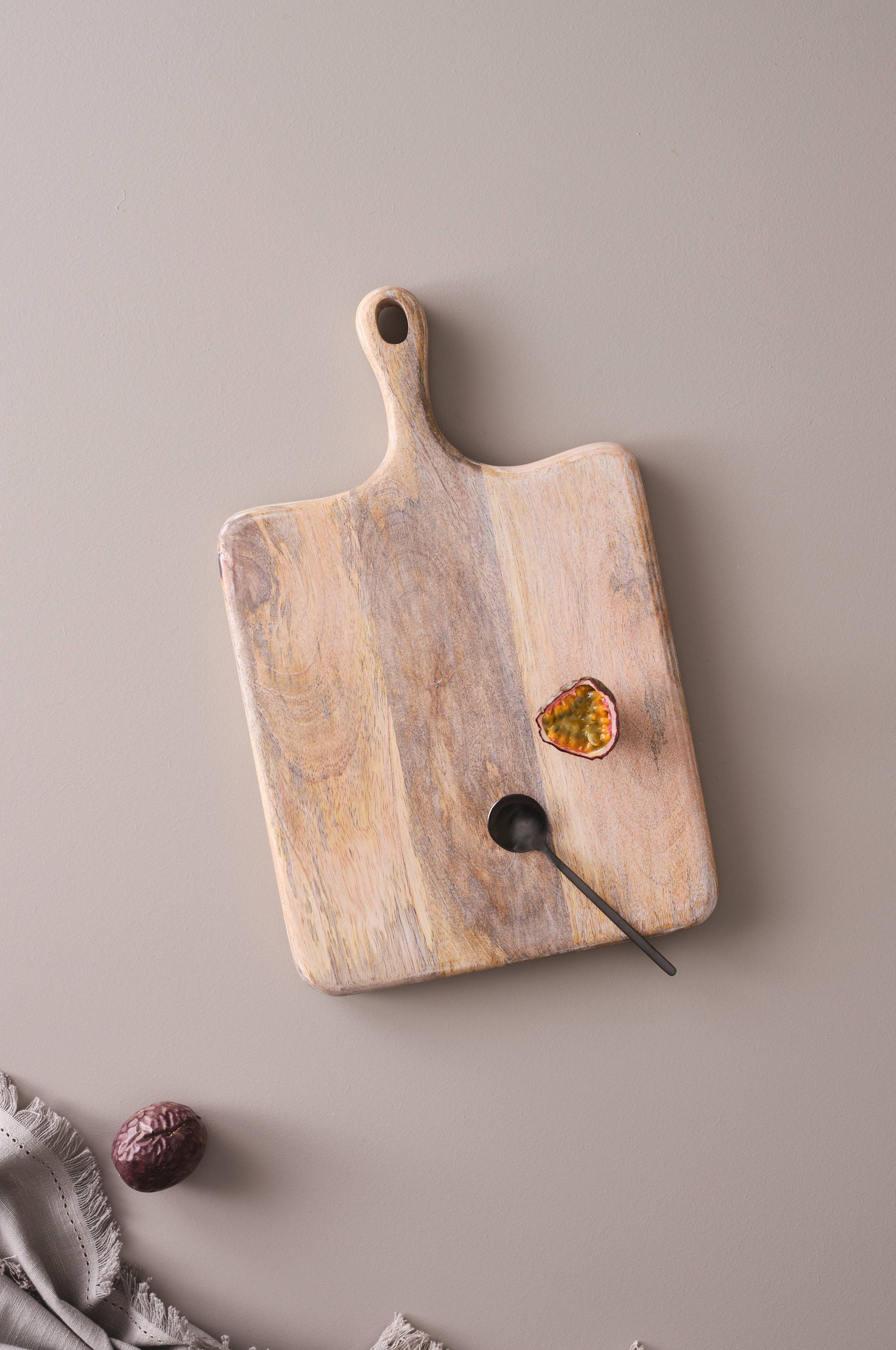 Deska do krojenia wykonana z pięknie żyłkowanego drewna mango z certyfikatem FSC. Miękka powierzchnia nie została zakonserwowana, a ze względu na naturalne różnice drewna, każda deska jest wyjątkowa. Deska ma wygodnie zaokrąglone brzegi i uchwyt z otworem.