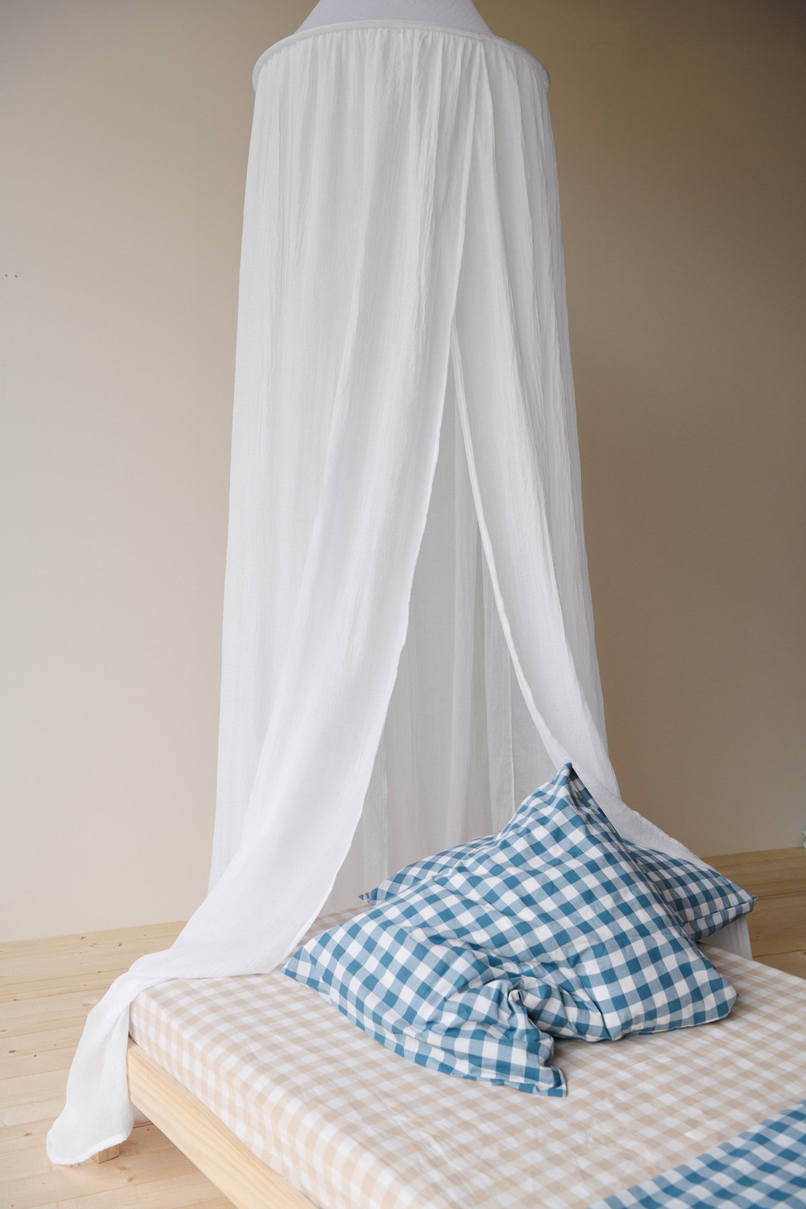 Baldachim z tkaniny, który zapewnia przyjemny spadek. Ten baldachim jest otwarty zarówno z przodu, jak i z tyłu, co jest zaletą, jeśli chcesz umieścić lampkę nocną na ścianie za łóżkiem. Zamontuj baldachim w pokoju dziecięcym, aby stworzyć przytulną atmosferę nad łóżkiem dziecka. Jednokolorowy baldachim łóżka jest dostępny w kilku kolorach, dzięki czemu można go łatwo dopasować.