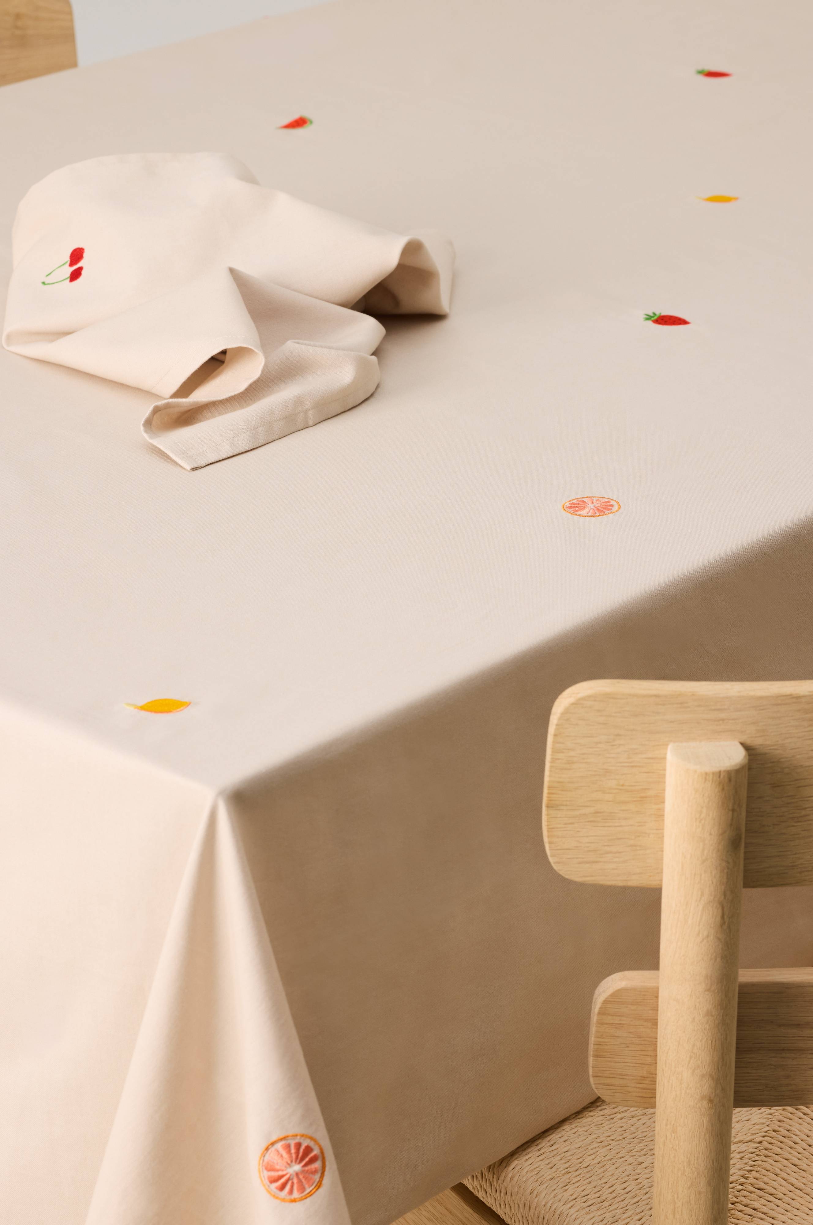 Obrus CILIA ma gładką podstawę ozdobioną haftowanymi owocami, tworząc uroczy punkt centralny dla Twojej jadalni. Doskonale łączy klasyczne elementy z nowoczesnym stylem, dzięki czemu każdy posiłek będzie wizualnie zachwycającym doświadczeniem. Idealny do modnych wnętrz.