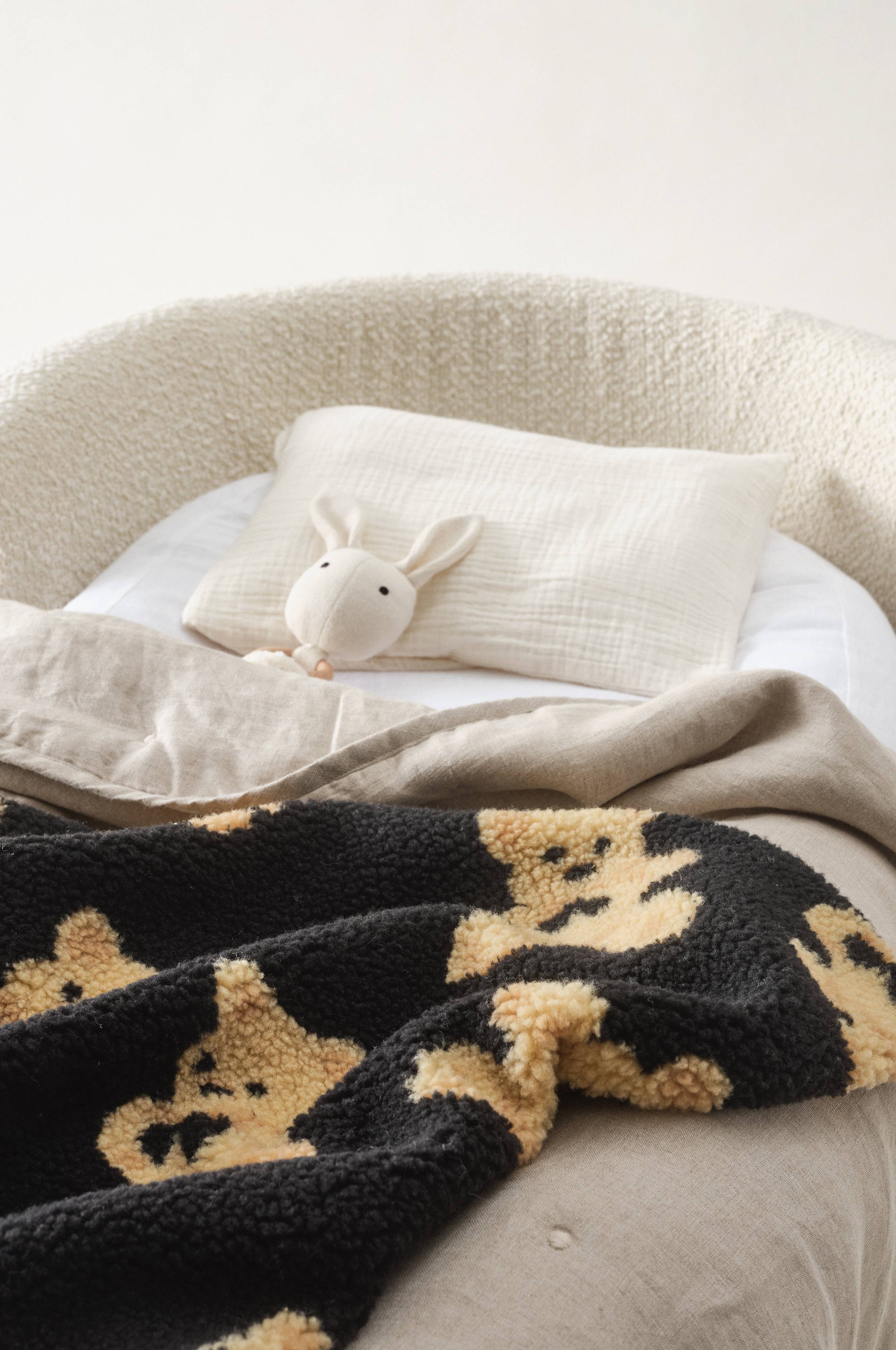 Kocyk dziecięcy z miękkiego i przytulnego poliestrowego pluszu z radosnym, nadrukowanym wzorem misiów na przedniej stronie. Kocyk wyściełany jest tkanym, jasnym materiałem. Miękki i przytulny kocyk będzie równie dobrze pasować do łóżeczka dziecięcego, jak i samochodu lub na sofę.