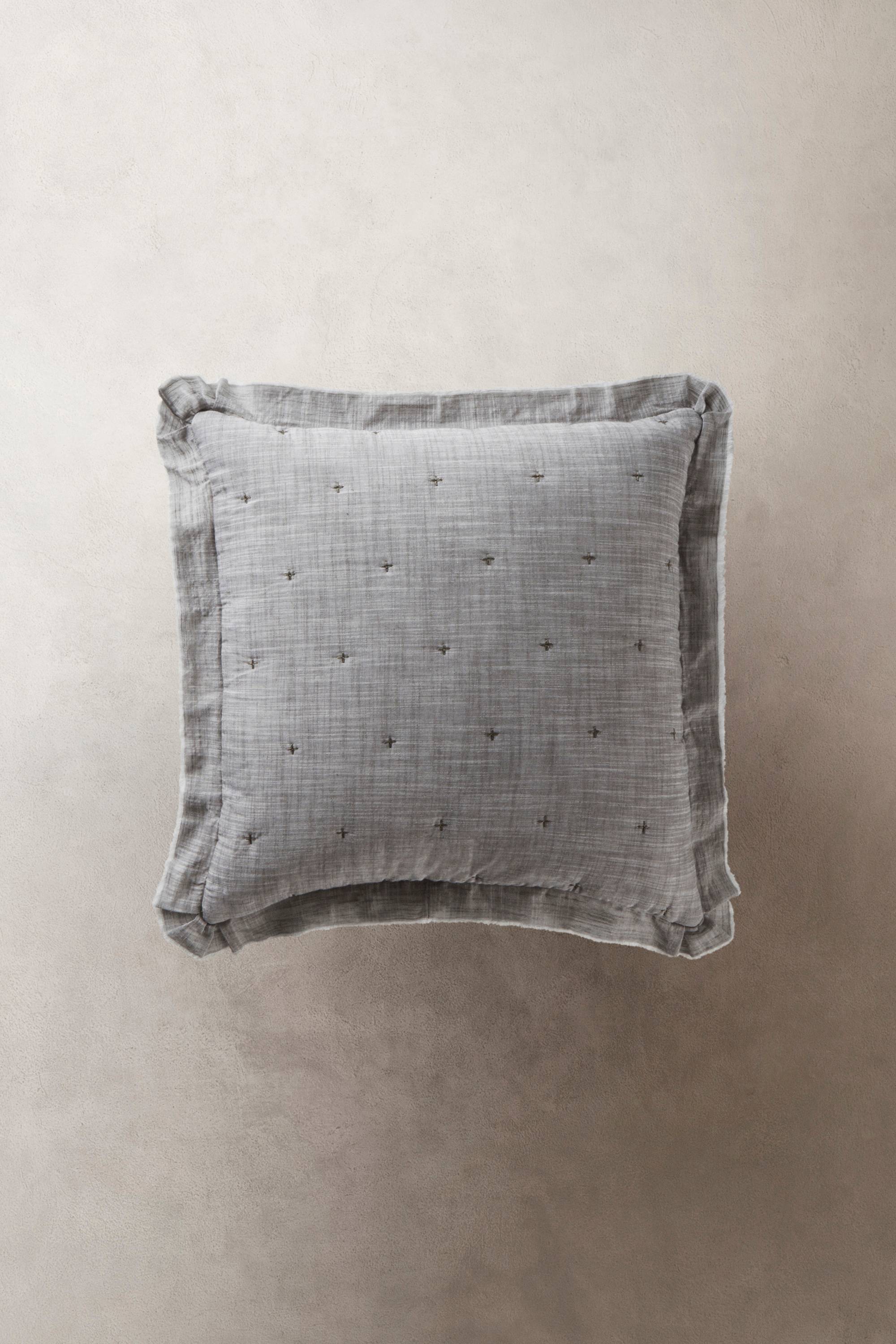 Poszewka uszyta jest z miękkiej tkaniny bawełnianej typu slub, która została poddana praniu przemysłowemu, co oznacza, że została wyprana zaraz po uszyciu. Efekt slub nadaje tkaninie wyrazistej faktury. Tkanina w elegancki melanż jest lekko watowana, z prostym pikowaniem z haftowanych guziczków, które tworzą dyskretny wzór zdobiący przednią stronę. Skrzydło z surową lamówką podkreśla miękki styl. Tylna strona poszewki wykonana jest z bawełny. Zamek błyskawiczny w spodniej krawędzi.