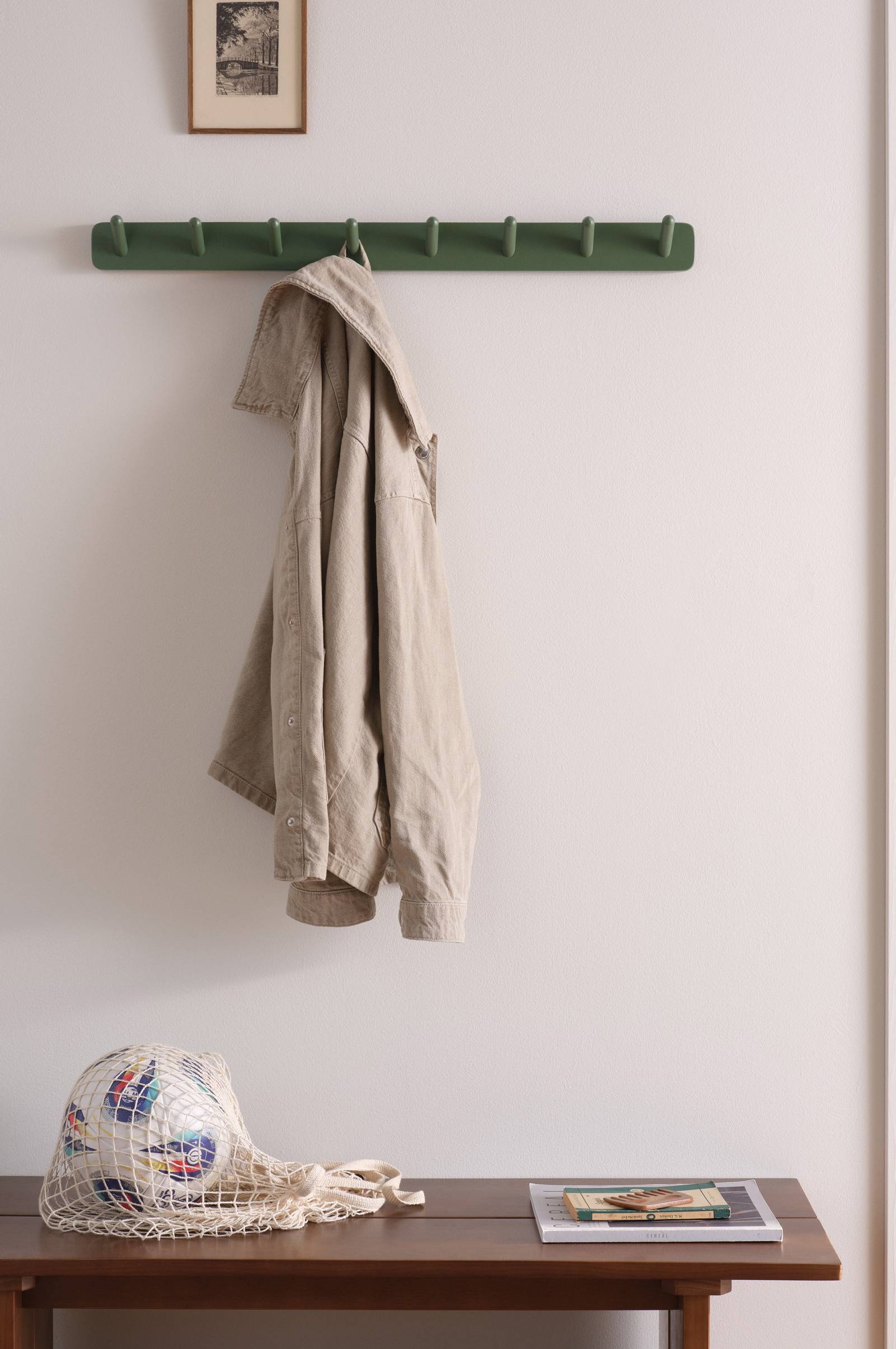 Wieszak COLE to klasyczna listwa z haczykami wykonana z drewna sosnowego z certyfikatem FSC. Listwa jest pomalowana w łagodne kolory i ma osiem prostych, karbowanych u góry haczyków z bielonej sosny. W kolorze naturalnym bielona jest całość, zarówno listwa, jak i haczyki. Haczyki są proste i ponadczasowe, a rogi listwy są zaokrąglone. Haczyki są montowane pod kątem, więc ubrania i torebki wiszą pewnie i nie ześlizgują się na ziemię. Wymaga częściowego montażu. Do produktu dołączona jest instrukcja.