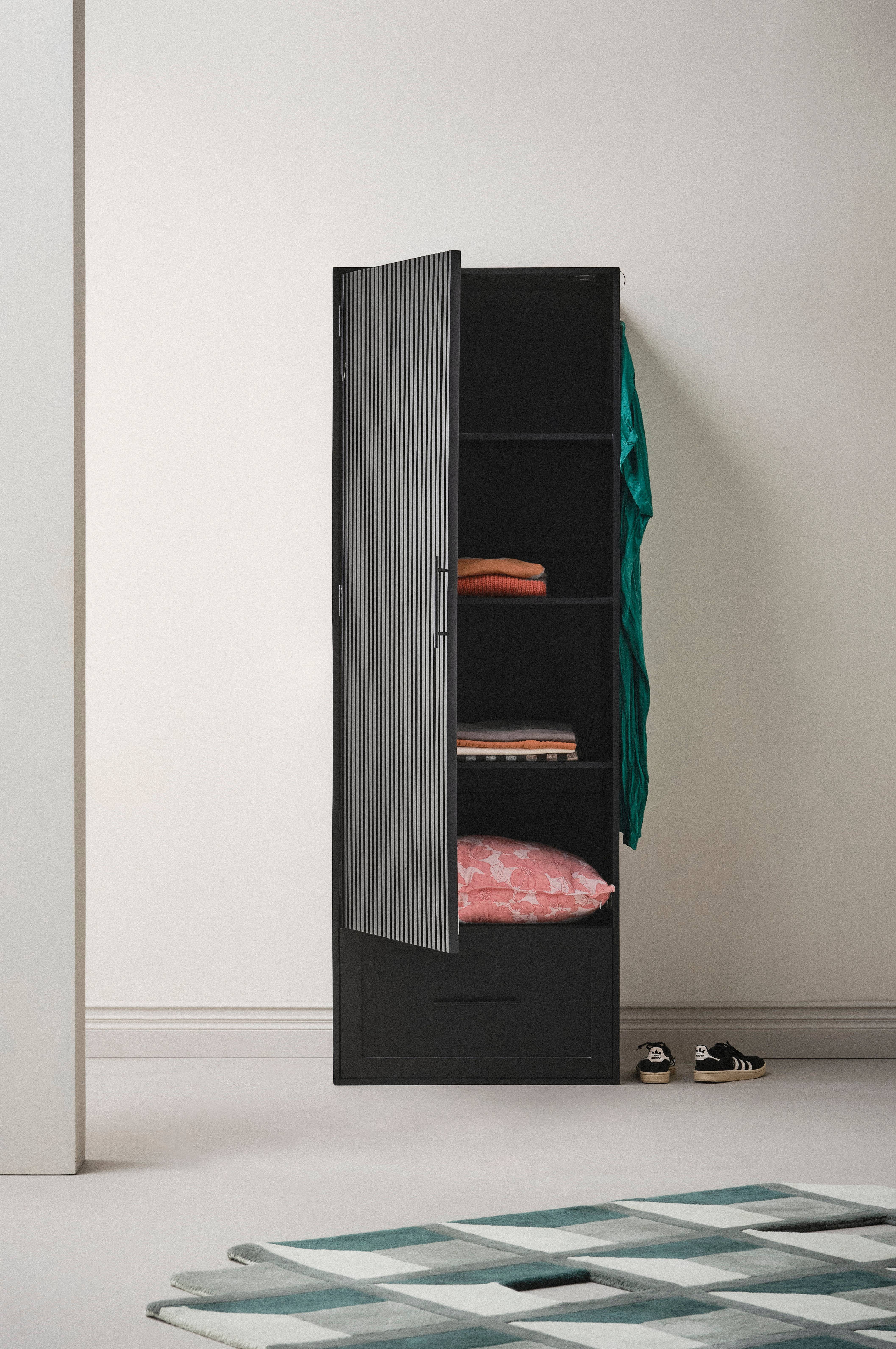 Szafa z drewna mango i płyty MDF o matowej powierzchni. Drzwi wykonane są z kwadratowych listew, między którymi są prześwity. W dolnej części szafy znajduje się szuflada. Wewnątrz szafy zamontowany jest drążek z drewna oraz nieruchoma półka. Zarówno szuflada, jak i drzwi wyposażone są w metalowe uchwyty, drzwi zamykane są na zamek magnetyczny.