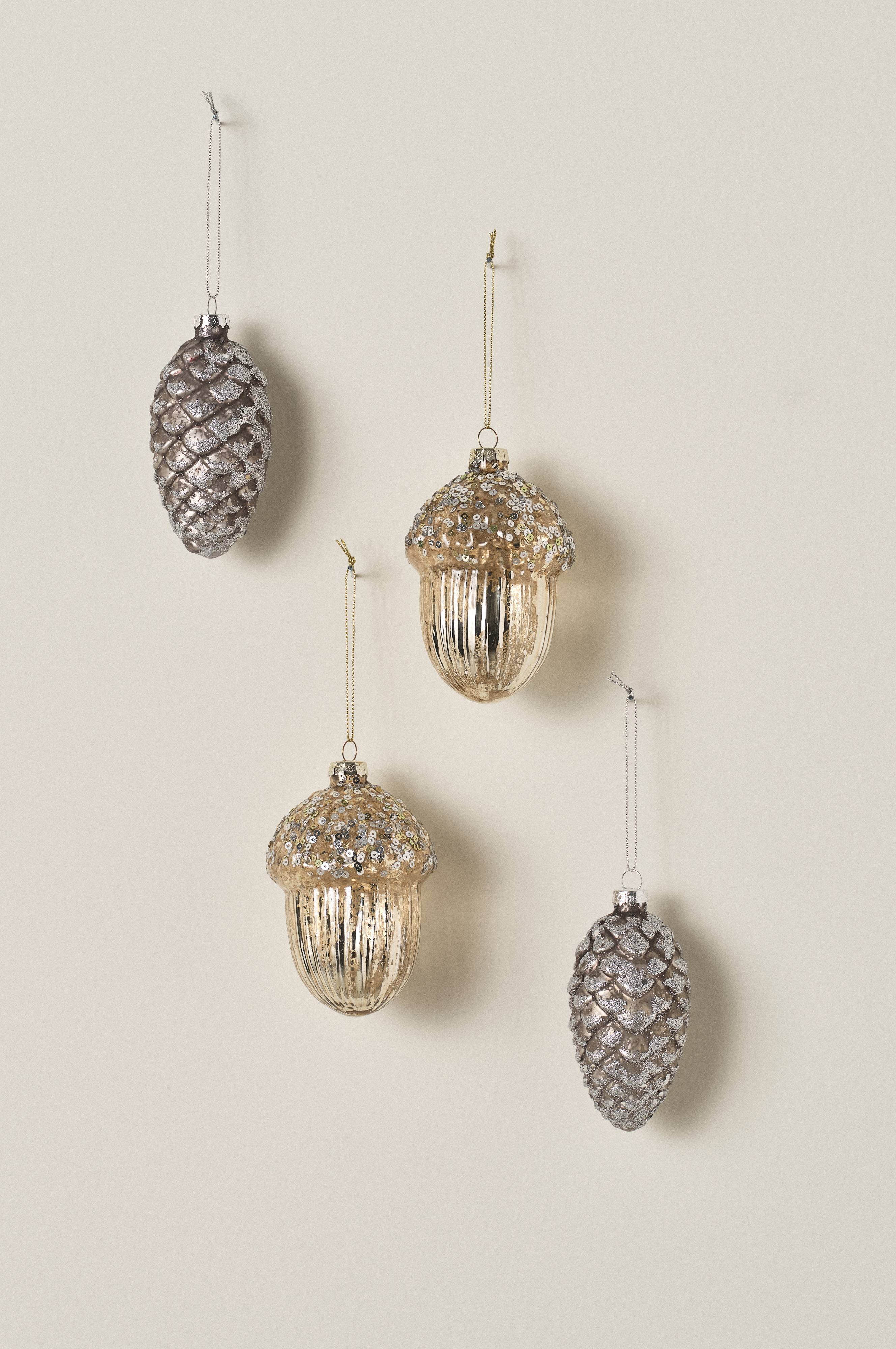 4 szklane szyszki i żołędzie dekoracyjnie pomalowane w kolorach złota oraz srebra i z brokatowym wykończeniem. Opakowanie zawiera dwa różne modele, po dwie sztuki każdego. Wszystkie wyposażono w niewielki uchwyt do zawieszenia, więc możesz umieścić je w miejscu, które chcesz udekorować.
