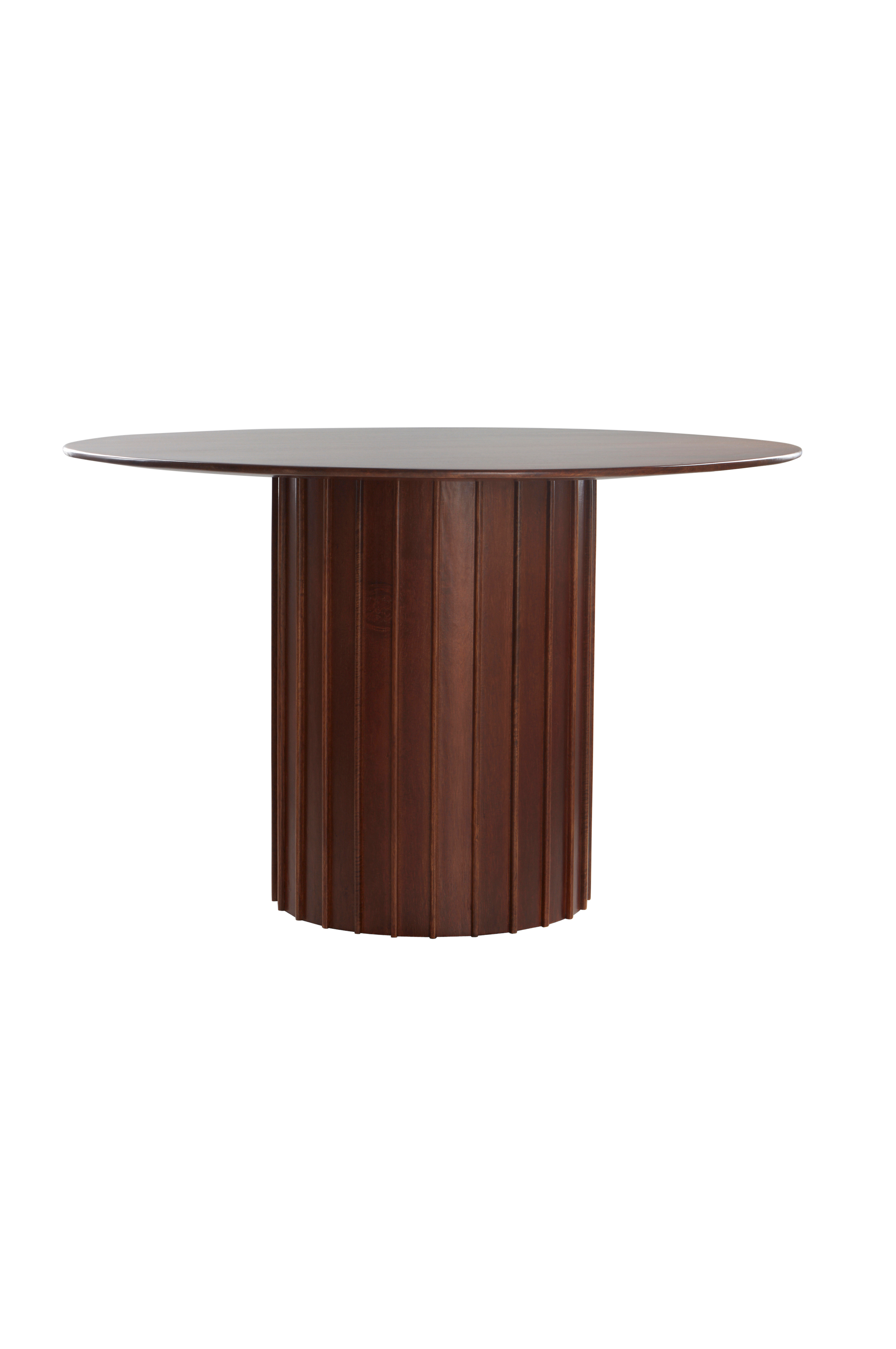 Okrągły stół do jadalni z litego drewna mango w ciemnym kolorze ze stabilną, okrągłą kolumną. Nic tak nie pogłębi uczucia bliskości i więzi rodzinnych jak wspólny posiłek przy okrągłym stole. Wymaga częściowego montażu. Do produktu dołączona jest instrukcja montażu.
