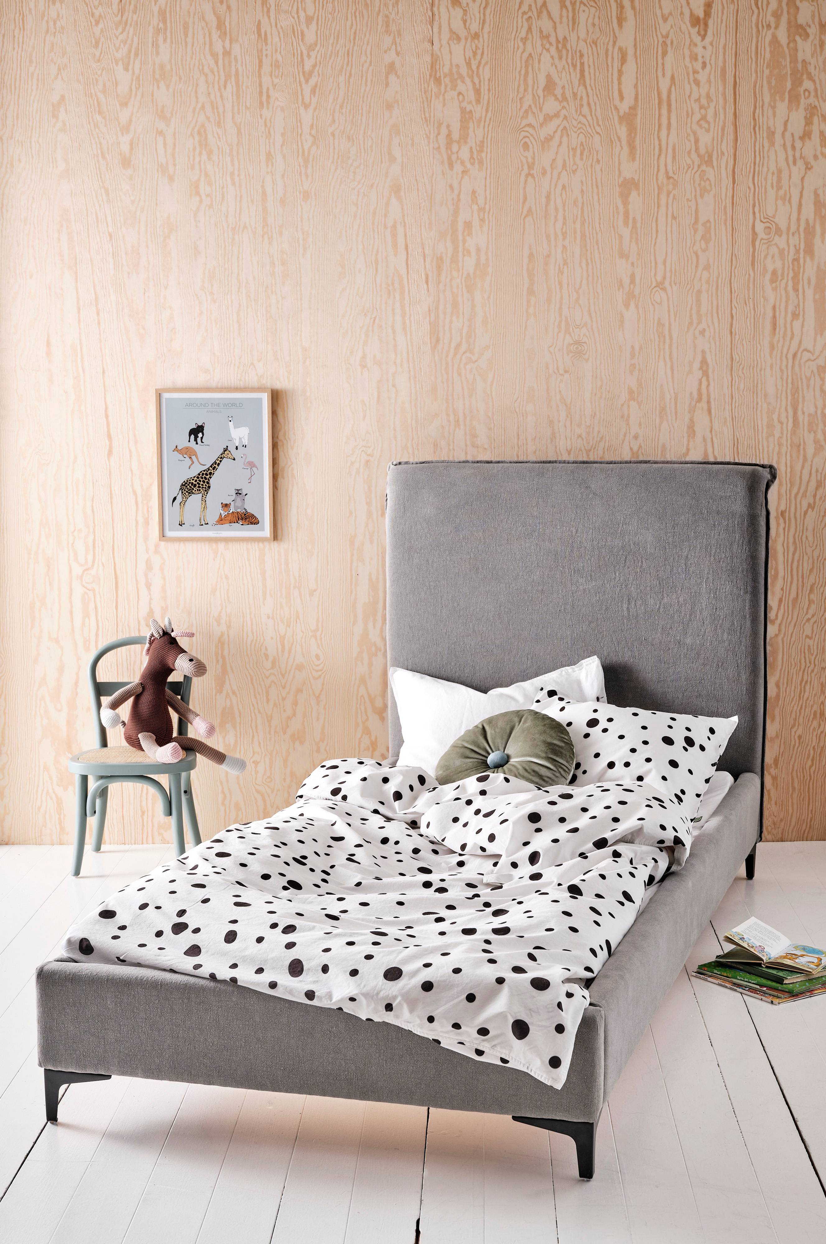 Łóżko dziecięce z pokryciem z przewiewnego lnu, ramą ze sklejki i miękkim piankowym wypełnieniem z poliuretanu. Miękkie i przytulne łóżko, które sprawdzi się znakomicie, gdy Twoja pociecha wyrosła już z łóżka dla maluchów. Używać z materacem w rozmiarze 90x200 cm. Materac sprzedawany oddzielnie.